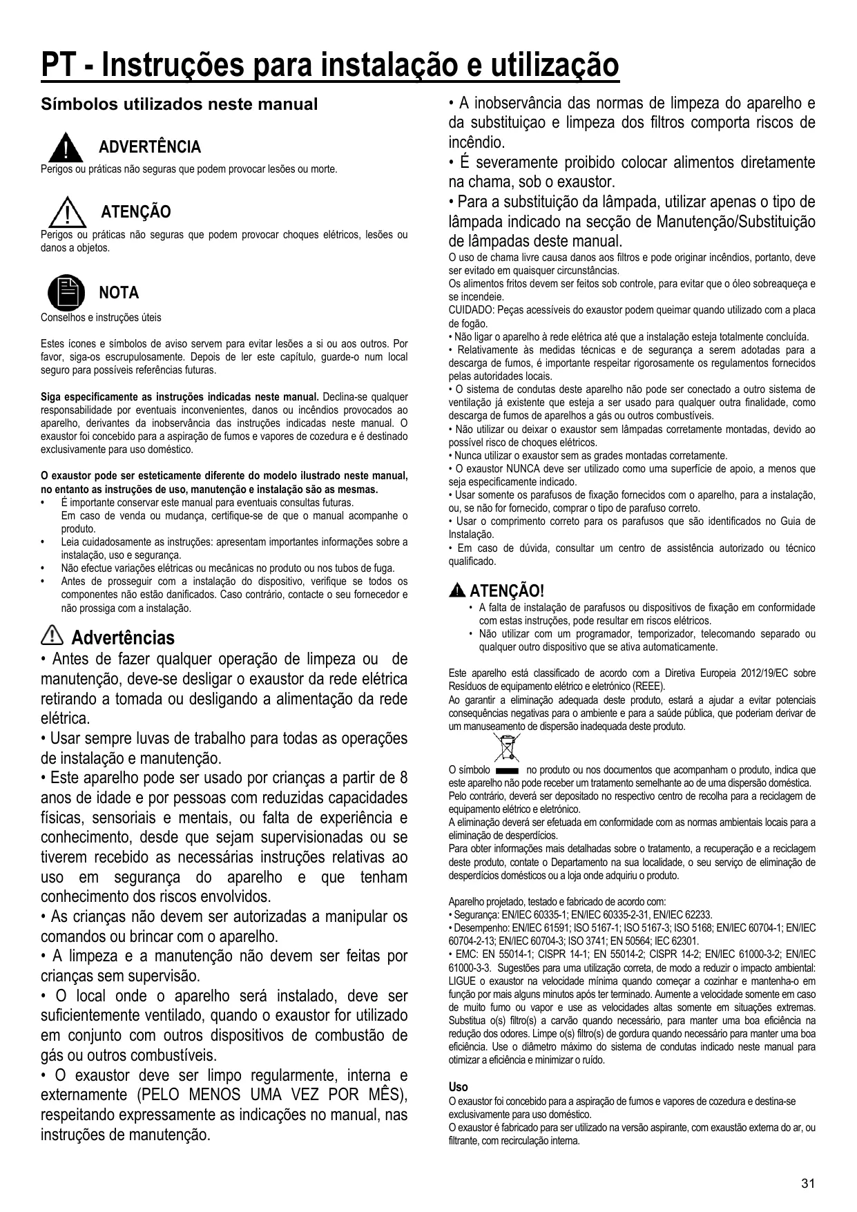 O símbolo no produto ou nos documentos que acompanham o produto, indica que este aparelho não pode receber um tratamento semelhante ao de uma dispersão doméstica. Pelo contrário, deverá ser depositado no respectivo centro de recolha para a reciclagem de equipamento elétrico e eletrónico. A eliminação deverá ser efetuada em conformidade com as normas ambientais locais para a eliminação de desperdícios. Para obter informações mais detalhadas sobre o tratamento, a recuperação e a reciclagem deste produto, contate o Departamento na sua localidade, o seu serviço de eliminação de desperdícios domésticos ou a loja onde adquiriu o produto. Aparelho projetado, testado e fabricado de acordo com: • Segurança: EN/IEC 60335-1; EN/IEC 60335-2-31, EN/IEC 62233. • Desempenho: EN/IEC 61591; ISO 5167-1; ISO 5167-3; ISO 5168; EN/IEC 60704-1; EN/IEC 60704-2-13; EN/IEC 60704-3; ISO 3741; EN 50564; IEC 62301. • EMC: EN 55014-1; CISPR 14-1; EN 55014-2; CISPR 14-2; EN/IEC 61000-3-2; EN/IEC 61000-3-3. Sugestões para uma utilização correta, de modo a reduzir o impacto ambiental: LIGUE o exaustor na velocidade mínima quando começar a cozinhar e mantenha-o em função por mais alguns minutos após ter terminado. Aumente a velocidade somente em caso de muito fumo ou vapor e use as velocidades altas somente em situações extremas. Substitua o(s) filtro(s) a carvão quando necessário, para manter uma boa eficiência na redução dos odores. Limpe o(s) filtro(s) de gordura quando necessário para manter uma boa eficiência. Use o diâmetro máximo do sistema de condutas indicado neste manual para otimizar a eficiência e minimizar o ruído.
