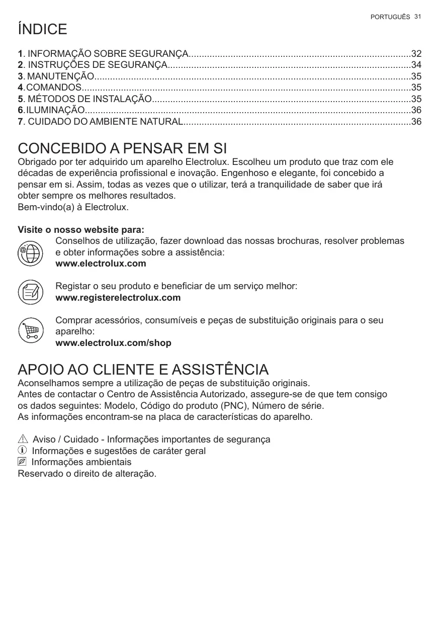 Obrigado por ter adquirido um aparelho Electrolux. Escolheu um produto que traz com ele décadas de experiência profissional e inovação. Engenhoso e elegante, foi concebido a pensar em si. Assim, todas as vezes que o utilizar, terá a tranquilidade de saber que irá obter sempre os melhores resultados. Bem-vindo(a) à Electrolux. Visite o nosso website para: Conselhos de utilização, fazer download das nossas brochuras, resolver problemas e obter informações sobre a assistência: www.electrolux.com Registar o seu produto e beneficiar de um serviço melhor: www.registerelectrolux.com Comprar acessórios, consumíveis e peças de substituição originais para o seu aparelho: www.electrolux.com/shop