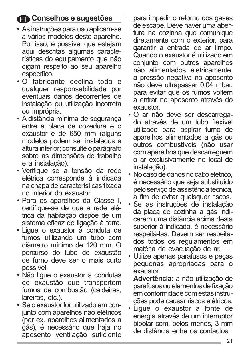 Ne pas évacuer l’air à travers un tube flexible utilisé pour l’aspiration des fumées des appareils alimentés au gaz ou avec d’autres combustibles (ne pas utiliser avec des appareils ayant une seule sortie d’air dans la pièce).