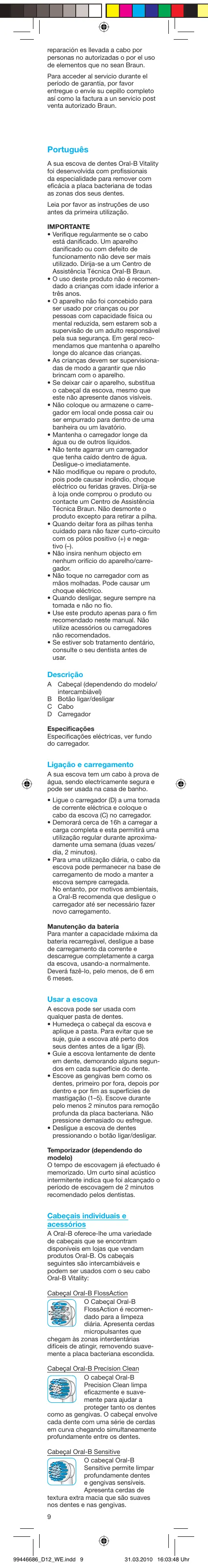 Português A sua escova de dentes Oral-B Vitality foi desenvolvida com profissionais da especialidade para remover com eficácia a placa bacteriana de todas as zonas dos seus dentes. Leia por favor as instruções de uso antes da primeira utilização. IMPORTANTE • Verifique regularmente se o cabo está danificado. Um aparelho danificado ou com defeito de funcionamento não deve ser mais utilizado. Dirija-se a um Centro de Assistência Técnica Oral-B Braun. • O uso deste produto não é recomendado a crianças com idade inferior a três anos. • O aparelho não foi concebido para ser usado por crianças ou por pessoas com capacidade física ou mental reduzida, sem estarem sob a supervisão de um adulto responsável pela sua segurança. Em geral recomendamos que mantenha o aparelho longe do alcance das crianças. • As crianças devem ser supervisionadas de modo a garantir que não brincam com o aparelho. • Se deixar cair o aparelho, substitua o cabeçal da escova, mesmo que este não apresente danos visíveis. • Não coloque ou armazene o carregador em local onde possa cair ou ser empurrado para dentro de uma banheira ou um lavatório. • Mantenha o carregador longe da água ou de outros líquidos. • Não tente agarrar um carregador que tenha caído dentro de água. Desligue-o imediatamente. • Não modifique ou repare o produto, pois pode causar incêndio, choque eléctrico ou feridas graves. Dirija-se à loja onde comprou o produto ou contacte um Centro de Assistência Técnica Braun. Não desmonte o produto excepto para retirar a pilha. • Quando deitar fora as pilhas tenha cuidado para não fazer curto-circuito com os pólos positivo (+) e negativo (–). • Não insira nenhum objecto em nenhum orifício do aparelho/carregador. • Não toque no carregador com as mãos molhadas. Pode causar um choque eléctrico. • Quando desligar, segure sempre na tomada e não no fio. • Use este produto apenas para o fim recomendado neste manual. Não utilize acessórios ou carregadores não recomendados. • Se estiver sob tratamento dentário, consulte o seu dentista antes de usar.
