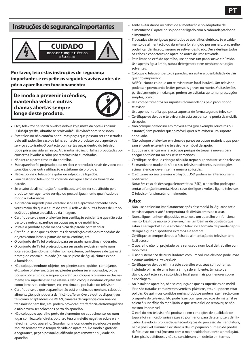 • N'utilisez pas de télévision directement après déballage. Attendez que la télévision se réchauffe à la température ambiante avant de l'utiliser. • Ne jamais relier un dispositif externe à un appareil sous tension. Éteindre non seulement la TV mais également les dispositifs qui lui sont reliés! Relier la fiche de la TV à la prise murale après avoir relié tous les dispositifs externes et l'antenne! • Assurer toujours le libre accès à la fiche secteur de la TV. • L'appareil n'est pas conçu pour un usage dans un lieu de travail équipé de moniteurs. • L'utilisation systématique des écouteurs à un niveau de volume élevé peut conduire à des dommages irréversibles de l'audition. • Assurer l'élimination de cet appareil et de tous les composants y compris les batteries, en conformité avec les normes environnementales. Dans le doute, entrer en contact avec l'autorité locale pour les détails concernant le recyclage. • Tout en installant l'appareil, se souvenir que les surfaces des meubles sont traitées avec divers vernis, plastiques, etc. ou qu'elles peuvent être cirées. Les produits chimiques contenus dans ces produits peuvent avoir une réaction avec le support de la TV. Ceci pourrait faire que des morceaux de matériaux collent à la surface des meubles, qu'il sera difficile d'enlever, voire impossible. • L'écran de la TV a été fabriqué selon des conditions de qualité supérieure et a été examiné en détail plusieurs fois, pour déceler les pixels défectueux. En raison des propriétés technologiques du processus de fabrication, il n'est pas possible d'éliminer l'existence d'un nombre restreint de points défectueux sur l'écran (même avec soin extrême, au cours de