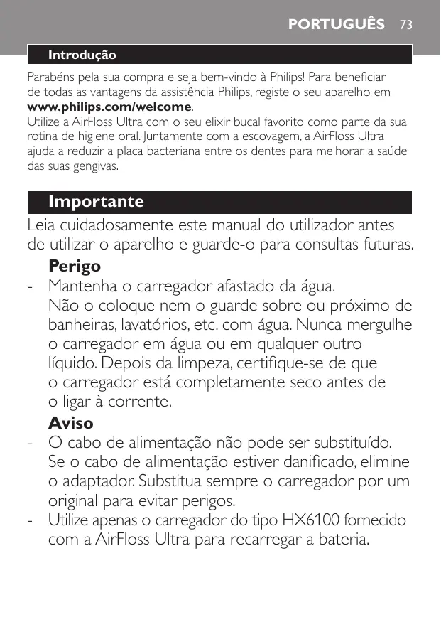 Importante Leia cuidadosamente este manual do utilizador antes de utilizar o aparelho e guarde-o para consultas futuras. Perigo -- Mantenha o carregador afastado da água. Não o coloque nem o guarde sobre ou próximo de banheiras, lavatórios, etc. com água. Nunca mergulhe o carregador em água ou em qualquer outro líquido. Depois da limpeza, certifique-se de que o carregador está completamente seco antes de o ligar à corrente. Aviso -- O cabo de alimentação não pode ser substituído. Se o cabo de alimentação estiver danificado, elimine o adaptador. Substitua sempre o carregador por um original para evitar perigos. -- Utilize apenas o carregador do tipo HX6100 fornecido com a AirFloss Ultra para recarregar a bateria.