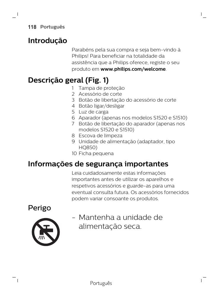 Aviso - O aparelho pertence à Classe III. - Para carregar a bateria, utilize apenas a fonte de alimentação destacável (tipo HQ850) fornecida com o aparelho. - A unidade de alimentação contém um transformador. Não corte a unidade de alimentação para a substituir por outra ficha, pois isto representa uma situação de perigo. - Este aparelho pode ser utilizado por crianças com idade igual ou superior a 8 anos e por pessoas com capacidades físicas, sensoriais ou mentais reduzidas ou sem experiência e conhecimentos, caso sejam supervisionadas ou lhes tenham sido dadas instruções relativas à utilização segura do aparelho e se compreenderem os perigos envolvidos. As crianças não devem brincar com o aparelho. A limpeza e manutenção não devem ser efetuadas por crianças sem supervisão. - Verifique sempre o aparelho antes de o utilizar. Não utilize o aparelho se este estiver danificado ou partido, pois isto pode provocar ferimentos. Substitua sempre uma peça danificada por uma equivalente de origem. - Não abra o aparelho para substituir a bateria recarregável.