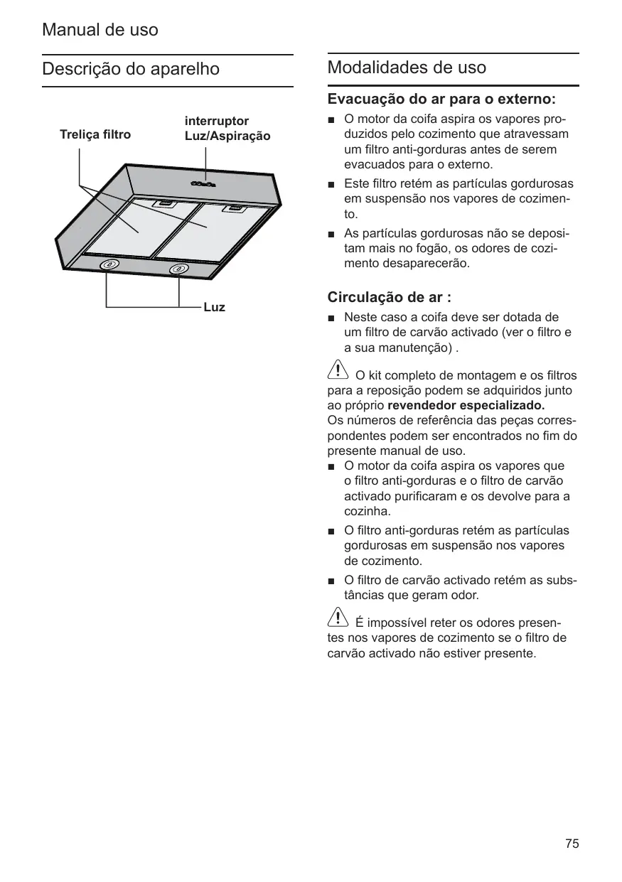 - Neste caso a coifa deve ser dotada de um FILTER de carvão activado (ver o FILTER e a sua manutenção).