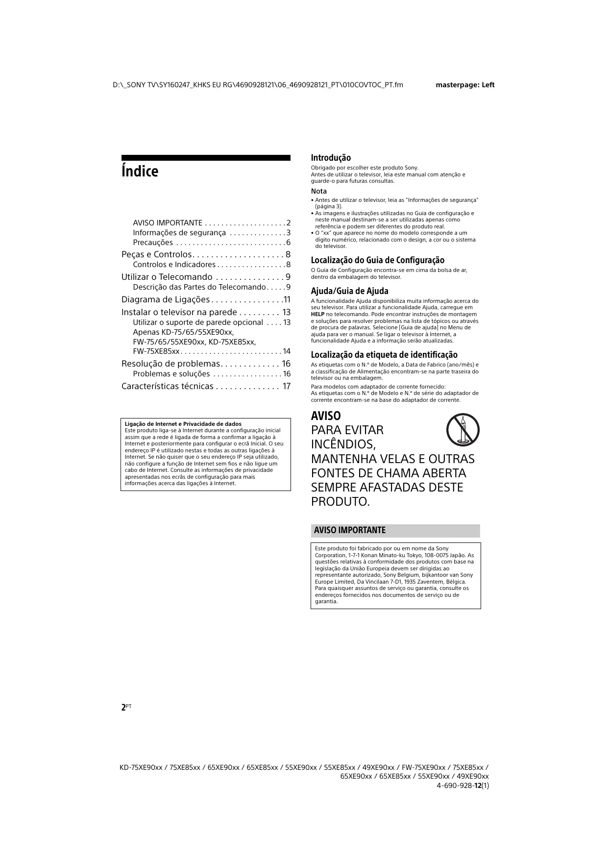 - 21DE KD-75XE90xx / 75XE85xx / 65XE90xx / 65XE85xx / 55XE90xx / 55XE85xx / 49XE90xx / FW-75XE90xx / 75XE85xx / 65XE90xx / 65XE85xx / 55XE90xx / 49XE90xx 4-690-928-12(1) D:\_SONY TV\SY160247_KHKS EU RG\4690928121\06_4690928121_PT\010COVTOC_PT.fm Introdução Índice Obrigado por escolher este produto Sony. Antes de utilizar o televisor, leia este manual com atenção e guarde-o para futuras consultas. Nota AVISO IMPORTANTE p. 2