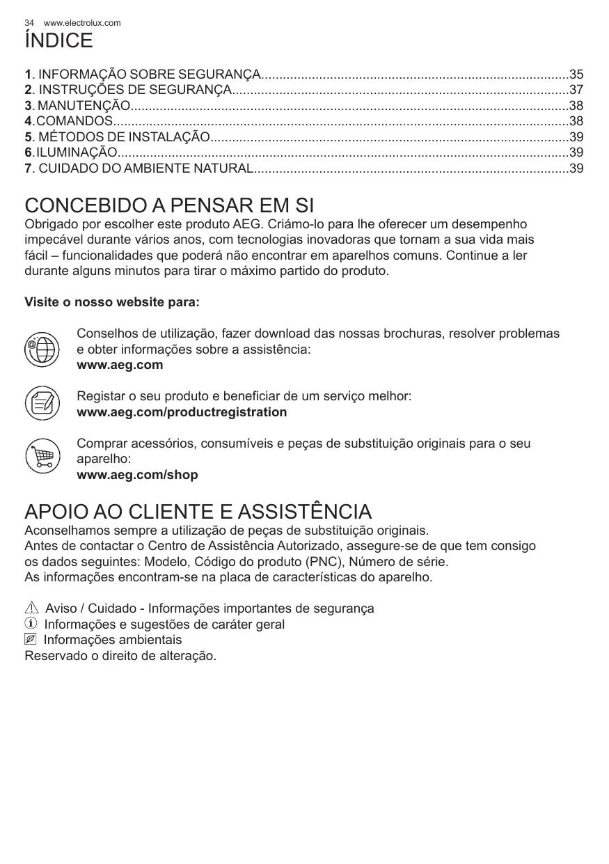 CONCEBIDO A PENSAR EM SI Obrigado por escolher este produto AEG. Criámo-lo para lhe oferecer um desempenho impecável durante vários anos, com tecnologias inovadoras que tornam a sua vida mais fácil – funcionalidades que poderá não encontrar em aparelhos comuns. Continue a ler durante alguns minutos para tirar o máximo partido do produto. Visite o nosso website para: Conselhos de utilização, fazer download das nossas brochuras, resolver problemas e obter informações sobre a assistência: www.aeg.com Registar o seu produto e beneficiar de um serviço melhor: www.aeg.com/productregistration Comprar acessórios, consumíveis e peças de substituição originais para o seu aparelho: www.aeg.com/shop
