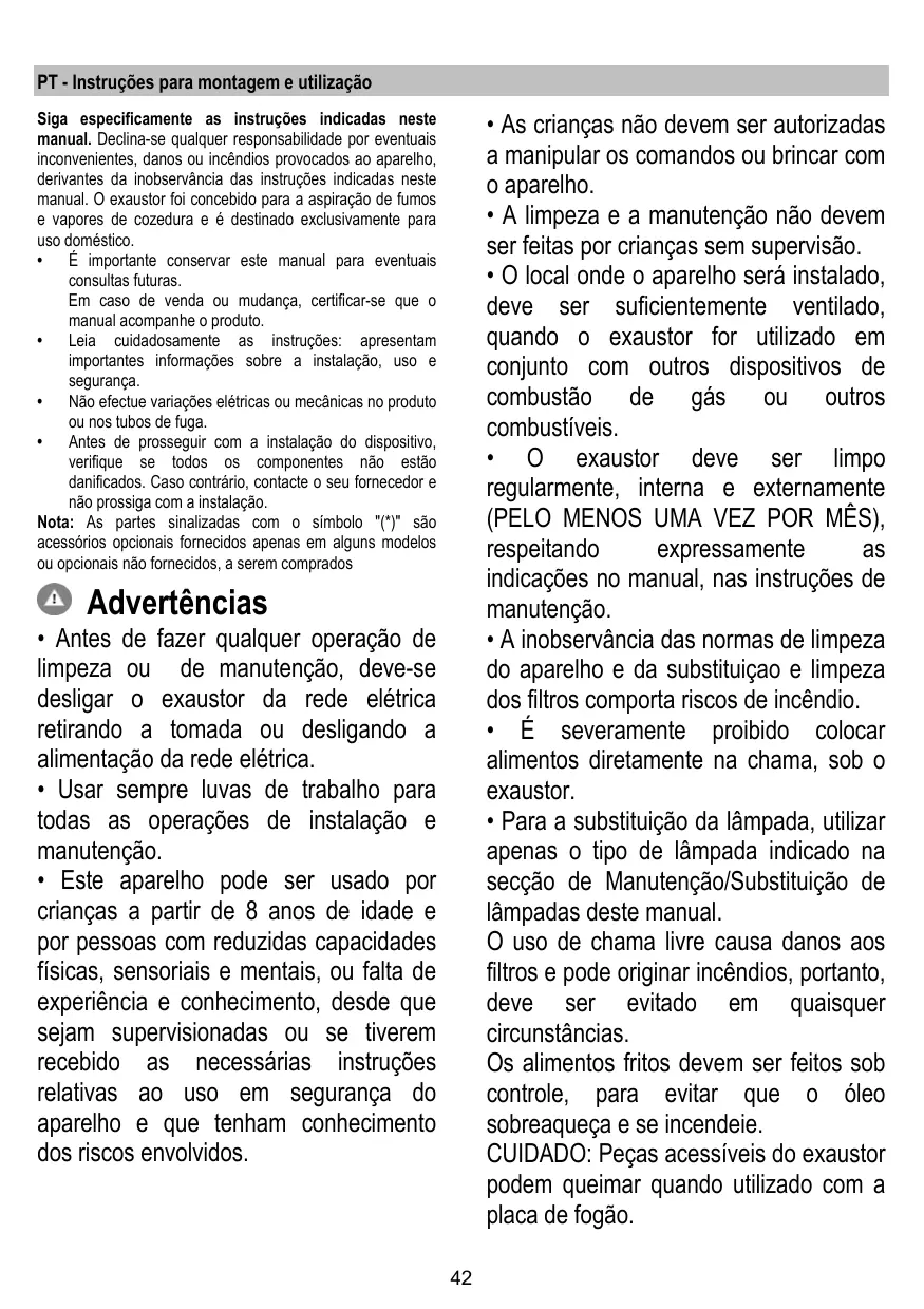 Montaje y modo de empleo Instruções para montagem e utilização Ο∆ΗΓΙΕΣ ΣΥΝΑΡΜΟΛΟΓΗΣΗΣ ΚΑΙ ΧΡΗΣΗΣ Monterings- och bruksanvisningar • Il est important de conserver ce livret pour pouvoir le consulter à tout moment. En cas de vente, de cession ou de déménagement, assurez-vous que la notice d'utilisation l'accompagne. • Veuillez lire attentivement les instructions, vous trouverez des informations importantes sur l'installation, le mode d'emploi et la sécurité. • Ne pas effectuer des modifications électriques ou mécaniques sur le produit ou sur les conduits d’évacuation. • Avant d'installer l'appareil, vérifiez qu’il n’y a aucun composant endommagé. Sinon, contactez votre revendeur et ne continuez pas l'installation. Remarque : Les pièces portant le symbole "(*)" sont des accessoires optionnels fournis uniquement avec certains modèles ou des pièces non fournies, à acheter.