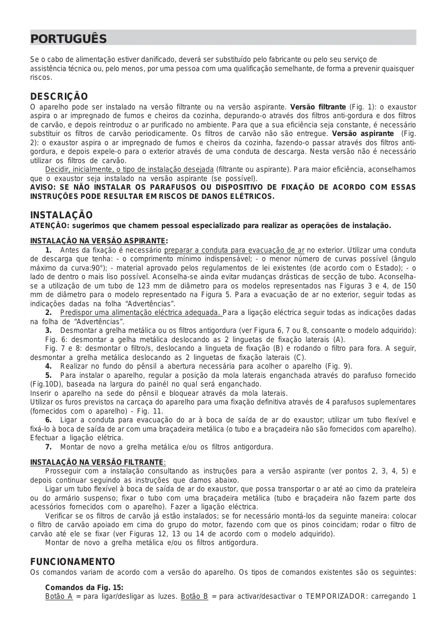 INSTALLATION VERSION ASPIRANTE : 1. Avant de commencer l’installation, il est nécessaire de prévoir le tuyau pour l’évacuation de l’air vers l’extérieur. Employez un tuyau d’évacuation qui ait : - la longueur minimale indispensable ; - le moins de coudes et de raccords possibles (angle maximum des coudes : 90°) ; - qui soit fait d’une matière approuvée par les normes en vigueur (suivant l’Etat) ; - sa surface intérieure la plus lisse possible. Nous vous conseillons aussi d’éviter les changements brusques de section du tuyau. Il est conseillé d’utiliser un tuyau ayant un diamètre de 123 mm pour les modèles représentés sur les Figures 3 et 4, un diamètre de 150 mm pour le modèle représenté sur la figure 5. Pour l’évacuation de l’air vers l’extérieur, suivez toutes les autres indications données à la page “Attention”. 2. Prévoyez une alimentation électrique adéquate. Pour le raccordement électrique, suivez toutes les autres indications qui sont données par la page “Attention”. 3. Enlevez la grille métallique ou les filtres à graisse (voir la Figure 6, 7 ou 8 selon le modèle que vous avez acheté): Fig. 6: enlevez la grille métallique en déplaçant les 2 blocages latéraux (A). Fig. 7 et 8: enlevez le(s) filtre(s) en déplaçant le blocage (B) et en tournant le filtre vers l’extérieur. Ensuite enlevez la grille métallique en déplaçant les 2 blocages latéraux (C). 4. Dans le fond de votre placard mural, faites le trou nécessaire afin d’insérer l’appareil (Fig. 9). 5. Pour installer l’appareil, réglez la position du ressort latéral d’accrochage (Fig. 10D), suivant l’épaisseur du panneau troué sur lequel il sera ancré. Insérez l’appareil à sa place dans le placard mural jusqu’à ce qu’il soit bloqué au moyen du ressort latéral. Utilisez les trous qui ont été prévus dans la carcasse de l’appareil pour le fixer ultérieurement en insérant les 4 vis supplémentaires (fournies) - Fig. 11. 6. Raccordez le conduit pour l’évacuation de l’air à la bouche de sortie de l’air de la hotte; utilisez un tuyau souple et bloquez-le sur la bouche de sortie de l’air de la hotte à l’aide d’un collier métallique (le tuyau et le collier ne sont pas fournis). Faites le raccordement électrique. 7. Remontez la grille métallique et/ou les filtres à graisse. INSTALLATION VERSION RECYCLAGE : Effectuez l’installation en suivant les instructions pour la version aspirante (voir point 2, 3, 4, 5), puis continuez en suivant les instructions figurant ci-dessous. Raccordez un flexible à l’ouverture de sortie d’air de la hotte de manière à acheminer l’air jusqu’en haut du meuble suspendu; bloquez le flexible avec une bande métallique (flexible et bande ne sont pas fournis). Effectuez le branchement électrique. Contrôlez si les filtres à charbon sont déjà installés; le cas échéant montez-les comme suit: posez le filtre à charbon sur le groupe moteur en faisant coïncider les goujons; tournez le filtre à charbon jusqu’à ce qu’il se bloque (voir les Figures 12, 13 ou 14 en fonction du modèle que vous avez acheté). Remonter la grille métallique et/ou les filtres à graisse.