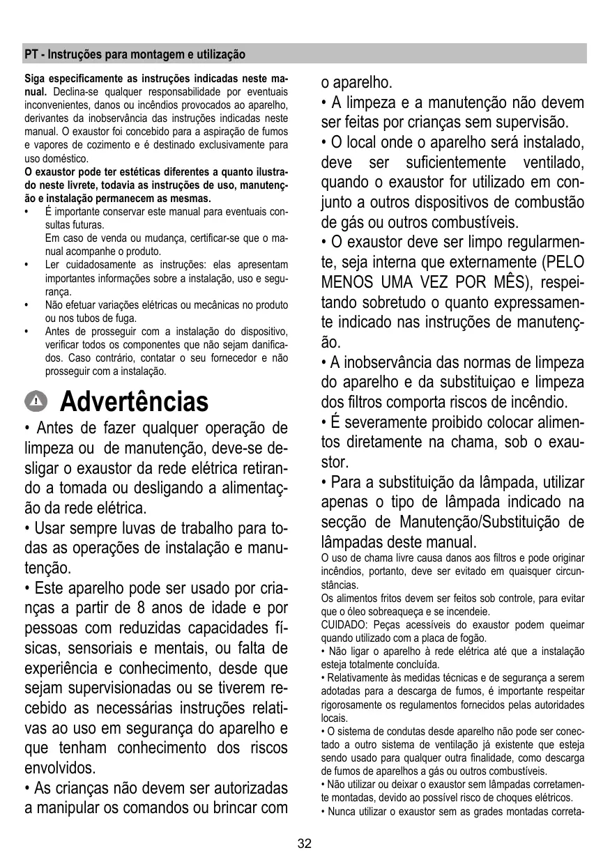 PT - Instruções para montagem e utilização Siga especificamente as instruções indicadas neste manual. Declina-se qualquer responsabilidade por eventuais inconvenientes, danos ou incêndios provocados ao aparelho, derivantes da inobservância das instruções indicadas neste manual. O exaustor foi concebido para a aspiração de fumos e vapores de cozimento e é destinado exclusivamente para uso doméstico. O exaustor pode ter estéticas diferentes a quanto ilustrado neste livrete, todavia as instruções de uso, manutenção e instalação permanecem as mesmas.