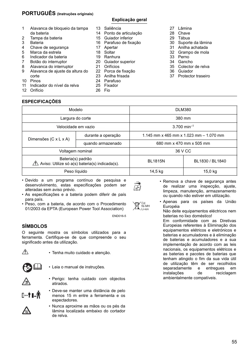 • Remova a chave de segurança antes de realizar uma inspecção, ajuste, limpeza, manutenção, armazenamento ou quando não estiver em utilização. • Apenas para os países da União Européia Não deite equipamentos eléctricos nem baterias no lixo doméstico! Em conformidade com as Diretivas Europeias referentes à Eliminação dos equipamentos elétricos e eletrónicos e baterias e acumuladores e à eliminação de baterias e acumuladores e a sua implementação de acordo com as leis nacionais, os equipamentos elétricos e as baterias e pacotes de baterias que tenham atingido o fim da sua vida útil de utilização têm de ser recolhidos separadamente e entregues em instalações de reciclagem ambientalmente compatíveis.