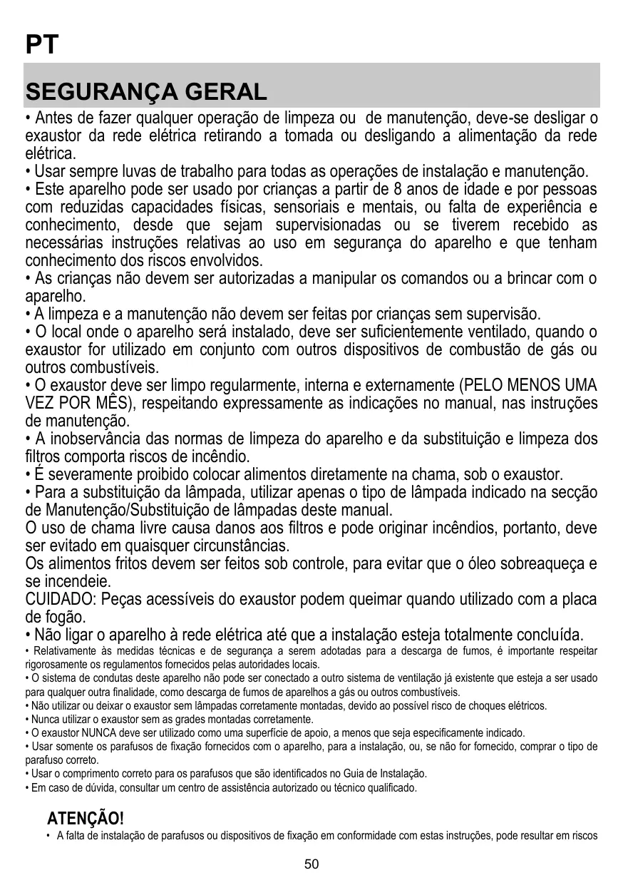 PT SEGURANÇA GERAL • Antes de fazer qualquer operação de limpeza ou de manutenção, deve-se desligar o exaustor da rede elétrica retirando a tomada ou desligando a alimentação da rede elétrica. • Usar sempre luvas de trabalho para todas as operações de instalação e manutenção. • Este aparelho pode ser usado por crianças a partir de 8 anos de idade e por pessoas com reduzidas capacidades físicas, sensoriais e mentais, ou falta de experiência e conhecimento, desde que sejam supervisionadas ou se tiverem recebido as necessárias instruções relativas ao uso em segurança do aparelho e que tenham conhecimento dos riscos envolvidos. • As crianças não devem ser autorizadas a manipular os comandos ou a brincar com o aparelho. • A limpeza e a manutenção não devem ser feitas por crianças sem supervisão. • O local onde o aparelho será instalado, deve ser suficientemente ventilado, quando o exaustor for utilizado em conjunto com outros dispositivos de combustão de gás ou outros combustíveis. • O exaustor deve ser limpo regularmente, interna e externamente (PELO MENOS UMA VEZ POR MÊS), respeitando expressamente as indicações no manual, nas instruções de manutenção. • A inobservância das normas de limpeza do aparelho e da substituição e limpeza dos filtros comporta riscos de incêndio. • É severamente proibido colocar alimentos diretamente na chama, sob o exaustor. • Para a substituição da lâmpada, utilizar apenas o tipo de lâmpada indicado na secção de Manutenção/Substituição de lâmpadas deste manual. O uso de chama livre causa danos aos filtros e pode originar incêndios, portanto, deve ser evitado em quaisquer circunstâncias. Os alimentos fritos devem ser feitos sob controle, para evitar que o óleo sobreaqueça e se incendeie. CUIDADO: Peças acessíveis do exaustor podem queimar quando utilizado com a placa de fogão. • Não ligar o aparelho à rede elétrica até que a instalação esteja totalmente concluída. • Relativamente às medidas técnicas e de segurança a serem adotadas para a descarga de fumos, é importante respeitar rigorosamente os regulamentos fornecidos pelas autoridades locais. • O sistema de condutas deste aparelho não pode ser conectado a outro sistema de ventilação já existente que esteja a ser usado para qualquer outra finalidade, como descarga de fumos de aparelhos a gás ou outros combustíveis. • Não utilizar ou deixar o exaustor sem lâmpadas corretamente montadas, devido ao possível risco de choques elétricos. • Nunca utilizar o exaustor sem as grades montadas corretamente. • O exaustor NUNCA deve ser utilizado como uma superfície de apoio, a menos que seja especificamente indicado. • Usar somente os parafusos de fixação fornecidos com o aparelho, para a instalação, ou, se não for fornecido, comprar o tipo de parafuso correto. • Usar o comprimento correto para os parafusos que são identificados no Guia de Instalação. • Em caso de dúvida, consultar um centro de assistência autorizado ou técnico qualificado.