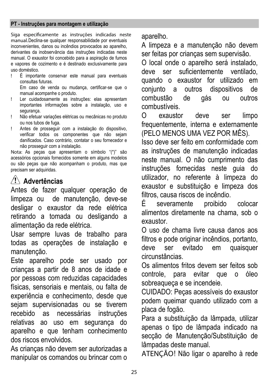PT - Instruções para montagem e utilização Siga especificamente as instruções indicadas neste manual. Declina-se qualquer responsabilidade por eventuais inconvenientes, danos ou incêndios provocados ao aparelho, derivantes da inobservância das instruções indicadas neste manual. O exaustor foi concebido para a aspiração de fumos e vapores de cozimento e é destinado exclusivamente para uso doméstico. É importante conservar este manual para eventuais consultas futuras. Em caso de venda ou mudança, certificar-se que o manual acompanhe o produto. Ler cuidadosamente as instruções: elas apresentam importantes informações sobre a instalação, uso e segurança. Não efetuar variações elétricas ou mecânicas no produto ou nos tubos de fuga. Antes de prosseguir com a instalação do dispositivo, verificar todos os componentes que não sejam danificados. Caso contrário, contatar o seu fornecedor e não prosseguir com a instalação. Nota: As peças que apresentam o símbolo “(*)” são acessórios opcionais fornecidos somente em alguns modelos ou são peças que não acompanham o produto, mas que precisam ser adquiridas. Advertências Antes de fazer qualquer operação de limpeza ou de manutenção, deve-se desligar o exaustor da rede elétrica retirando a tomada ou desligando a alimentação da rede elétrica. Usar sempre luvas de trabalho para todas as operações de instalação e manutenção. Este aparelho pode ser usado por crianças a partir de 8 anos de idade e por pessoas com reduzidas capacidades físicas, sensoriais e mentais, ou falta de experiência e conhecimento, desde que sejam supervisionadas ou se tiverem recebido as necessárias instruções relativas ao uso em segurança do aparelho e que tenham conhecimento dos riscos envolvidos. As crianças não devem ser autorizadas a manipular os comandos ou brincar com o
