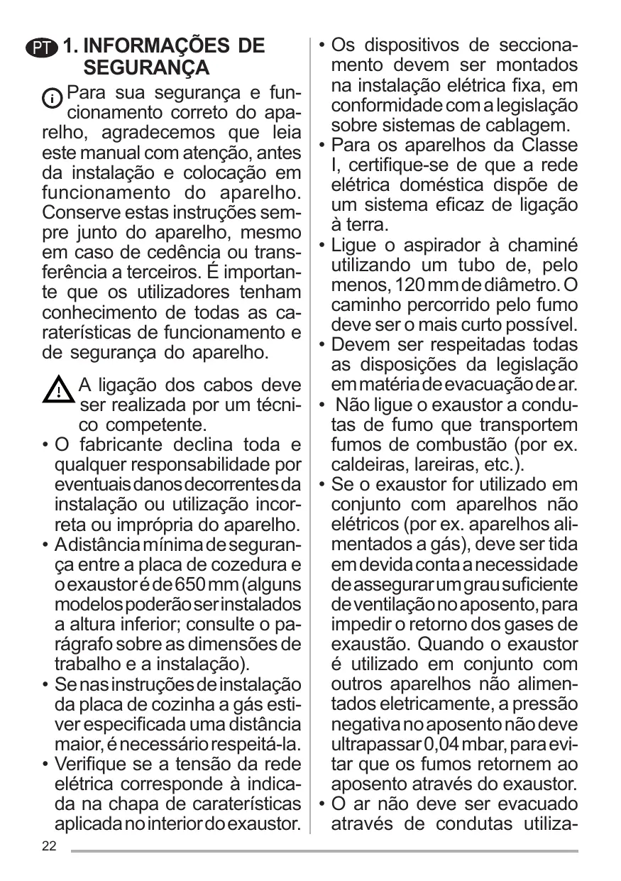 Les dispositifs de sectionnement doivent être montés dans l’installation fixe conformément aux normes sur les systèmes de câblage. Pour les appareils de Classe I, s’assurer que l’installation électrique de votre intérieur dispose d’une mise à la terre adéquate. Reliez l’aspirateur du conduit de cheminée avec un tube ayant un diamètre minimum de 120 mm. Le parcours des fumées doit être le plus court possible. Respecter toutes les normes concernant l’évacuation de l’air. Ne reliez pas la hotte aspirante aux conduits de cheminée qui acheminent les fumées de combustion (par ex. de chaudières, de cheminées, etc.). Si vous utilisez l’aspirateur en même temps que des appareils non électriques (par ex. fonctionnant au gaz), veillez à ce que la pièce soit adéquatement ventilée, afin d’empêcher le retour du flux des gaz d’évacuation. Si vous utilisez la hotte de cuisine en même temps que des appareils non alimentés à l’électricité, la pression négative dans la pièce ne doit pas dépasser 0,04 mbar, afin d’éviter que les fumées soient réaspirées dans la pièce où se trouve la hotte.