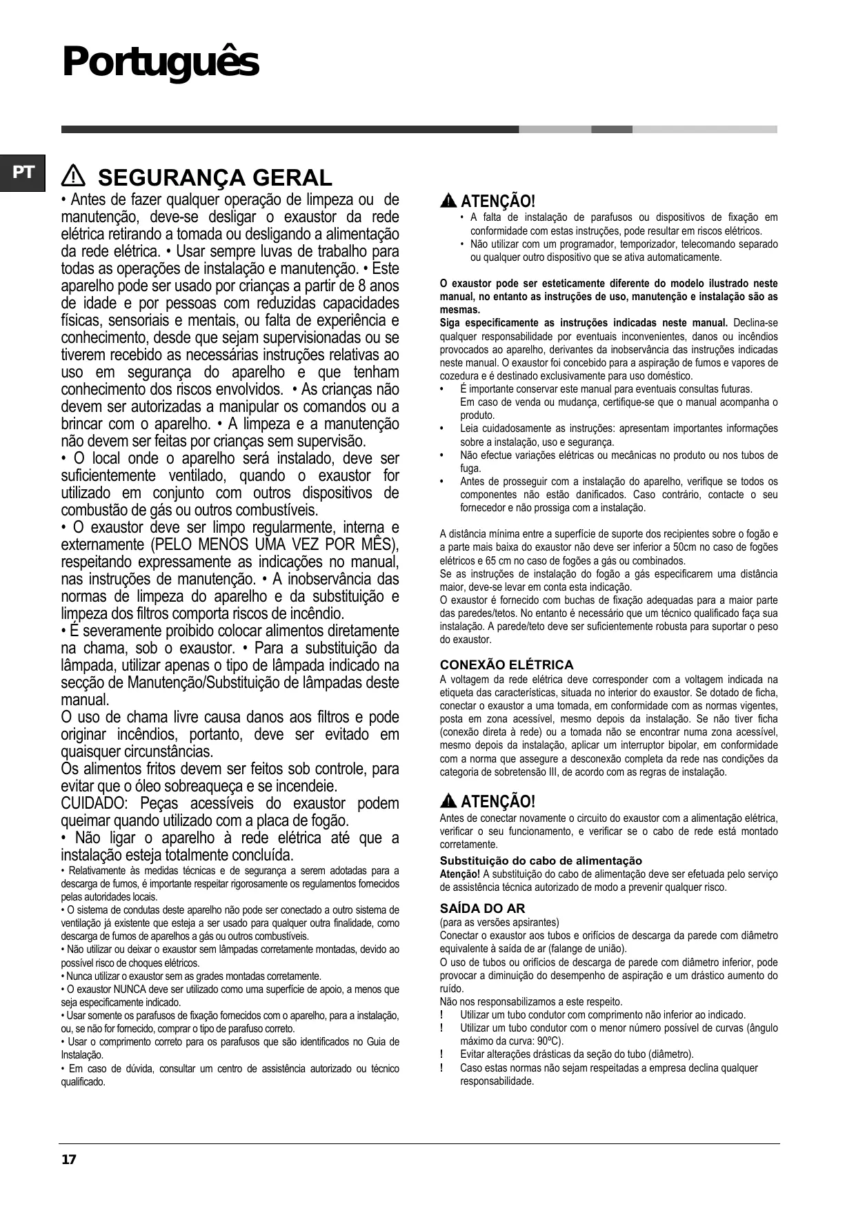 • El aire aspirado no debe ser transportado en un conducto usado para la descarga de humos producidos por dispositivos de combustión a gas u otros combustibles. • No utilizar ni dejar la campana sin las luces correctamente instaladas debido al posible riesgo de descarga eléctrica. • No utilizar nunca la campana sin la rejilla montada correctamente! • La campana NUNCA debe utilizarse como una superficie de apoyo a menos que así se indique específicamente.