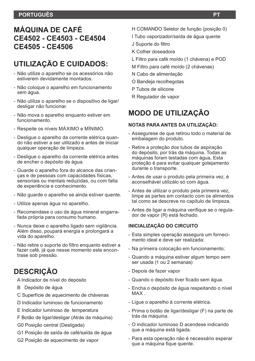 - Mettre l’appareil en marche en actionnant l’interrupteur marche/arrêt (F)situé sur la partie postérieure de la cafetière. - Le voyant lumineux (D) s’allume, indiquant que la machine est branchée et que l’eau est en train de chauffer. - Attendre que le voyant lumineux (E) s’allume. Ce qui nous indique que l’eau a atteint la température adéquate. - Placer un récipient sous le vaporisateur. - Ouvrir le régulateur de vapeur (R), en tournant vers la gauche, dans le sens contraire des aiguilles d’une montre. - Tourner le bouton de sélection (H) à la position sur café/eau (G1), pour activer la pompe. - L’eau chaude commencera à sortir par le tube vaporisateur. - Une fois que vous aurez obtenu la quantité d’eau chaude voulue, remettre le sélecteur de fonctions (H) en position centrale (G0), afin d'arrêter la pompe. - Fermer la commande (R) en la tournant vers la droite dans le sens des aiguilles d’une montre. OBTENTION DE VAPEUR - La vapeur sert à faire mousser le lait pour le cappuccino et aussi à chauffer d’autres liquides. - Mettre l’appareil en marche en actionnant l’interrupteur marche/arrêt F situé sur la partie postérieure de la cafetière.