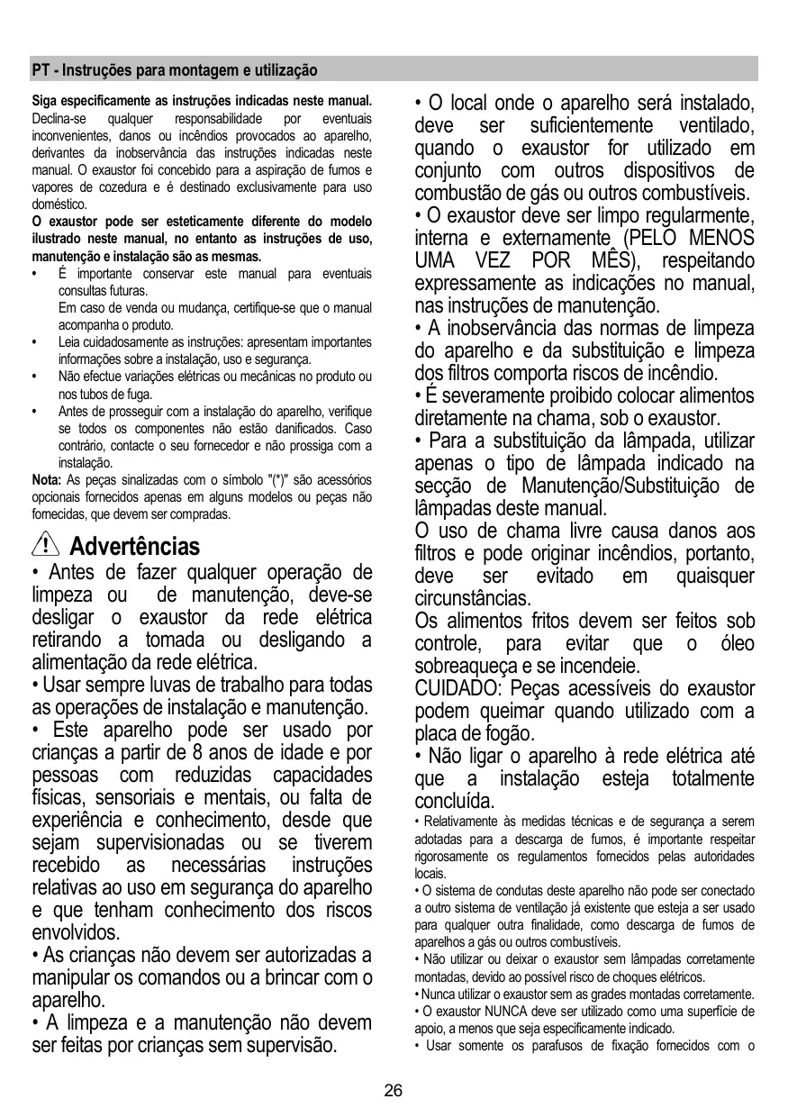 FR Notice de montage et mode d’emploi NL Montagevoorschriften en gebruiksaanwijzingen ES Montaje y modo de empleo PT Instruções para montagem e utilização EL ΟΔΗΓΙΕΣ ΣΥΝΑΡΜΟΛΟΓΗΣΗΣ ΚΑΙ ΧΡΗΣΗΣ • La hotte doit être régulièrement nettoyée à la fois à l'intérieur et à l'extérieur (AU MOINS UNE FOIS PAR MOIS); cela devrait se faire en conformité avec les instructions d'entretien. Le non respect des instructions expressément fournies concernant le nettoyage de la hotte et des filtres peut provoquer des risques d'incendie. • Ne pas flamber d’aliments sous la hotte. • Pour le remplacement de la lampe, utilisez uniquement le type de lampe spécifié dans la section remplacement/maintenance lampe dans ce manuel. L'utilisation d'une flamme nue est dommageable pour les filtres et peut causer un incendie, par conséquent, il est déconseillé de l'utiliser. La friture doit être faite avec soin afin de s’assurer que l’huile surchauffée ne prenne pas feu. AVERTISSEMENT: Lorsque la table de cuisson est en fonctionnement, les parties accessibles de la hotte peuvent devenir très chaudes. • Ne pas brancher l'appareil au réseau électrique avant que l'installation ne soit complètement terminée.