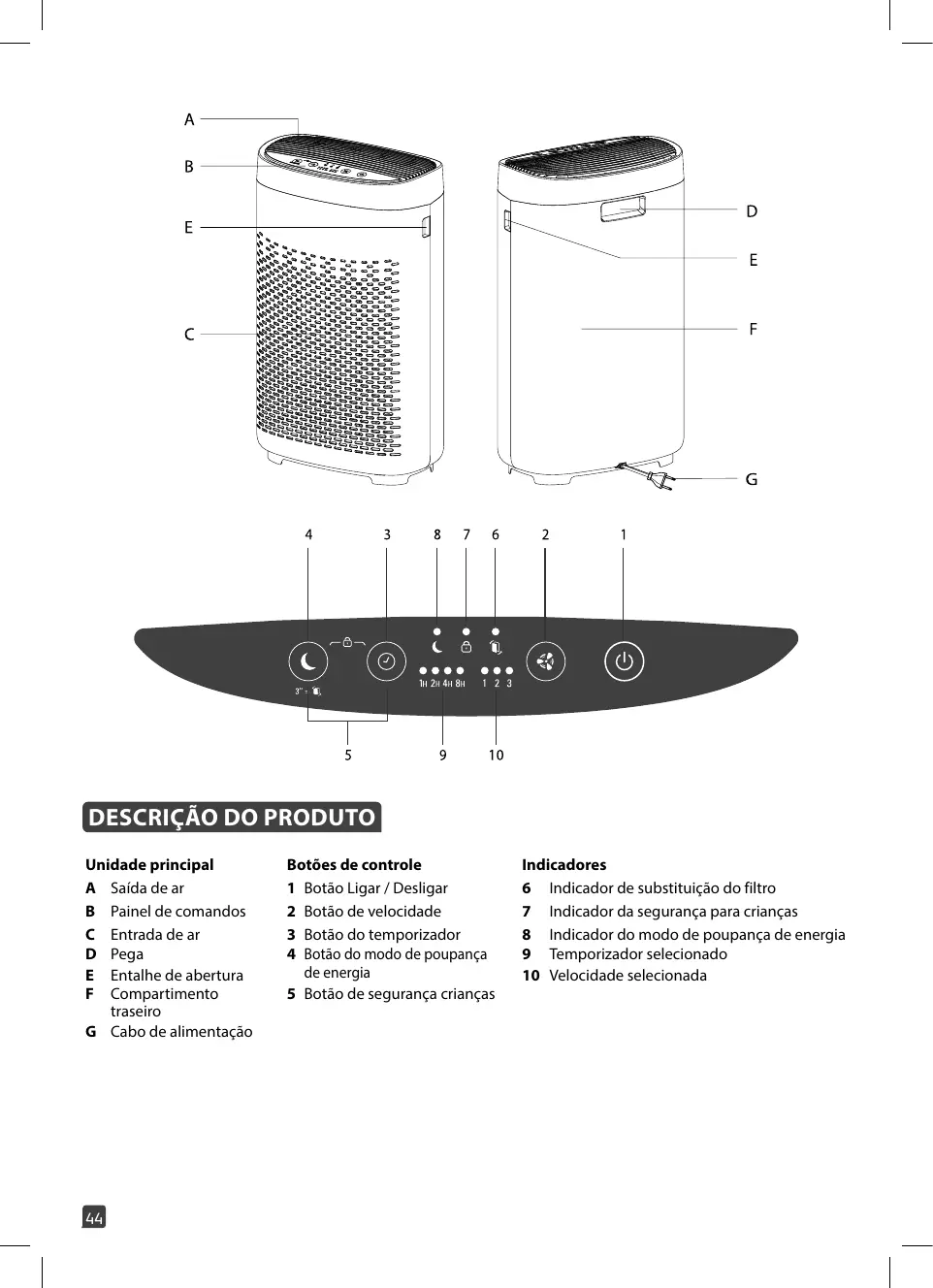 6 Indicateur de remplacement de filtre 7 Indicateur de la sécurité enfants 8 Indicateur de mode veille 9 Minuteur sélectionné 10 Vitesse sélectionnée