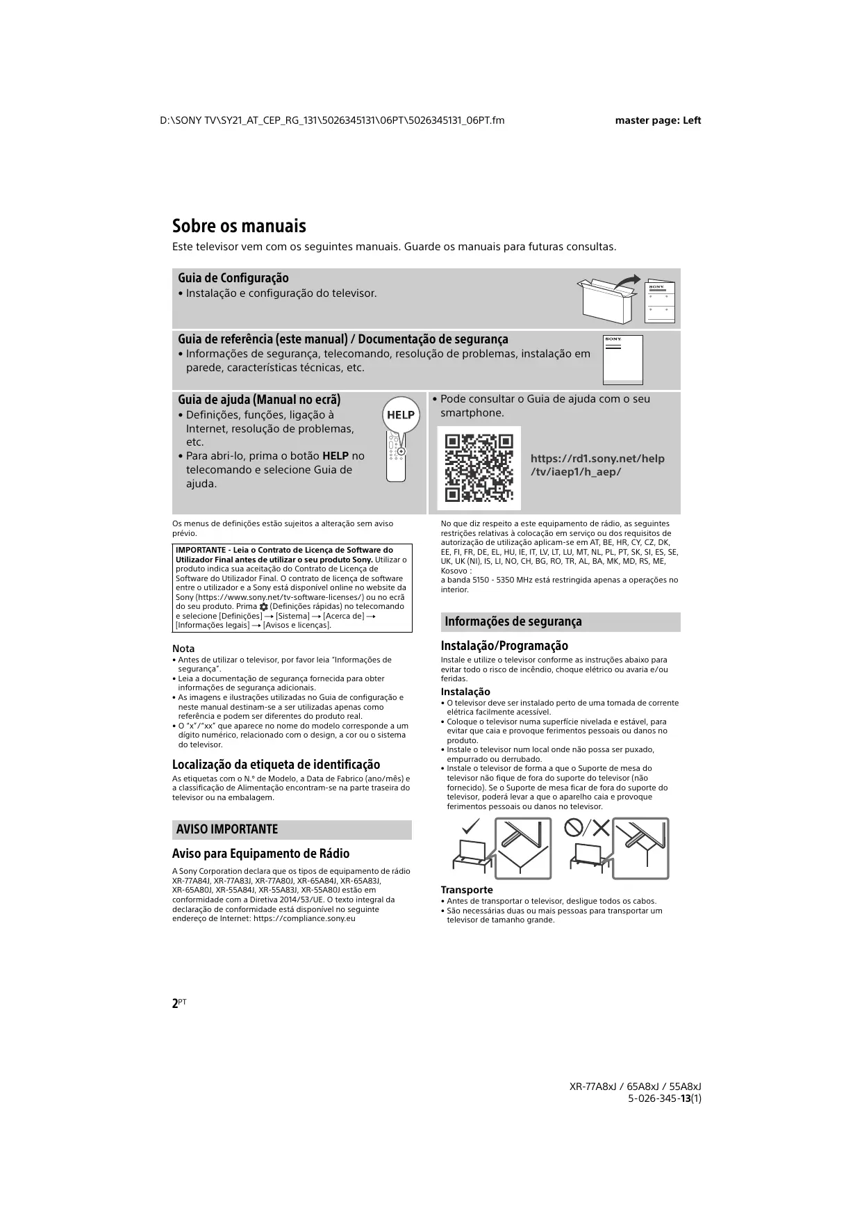 Encontre gratuitamente o manual do aparelho BRAVIA XR-55A80J - BRAVIA XR-65A80J - XR-77A80J SONY em formato PDF.
