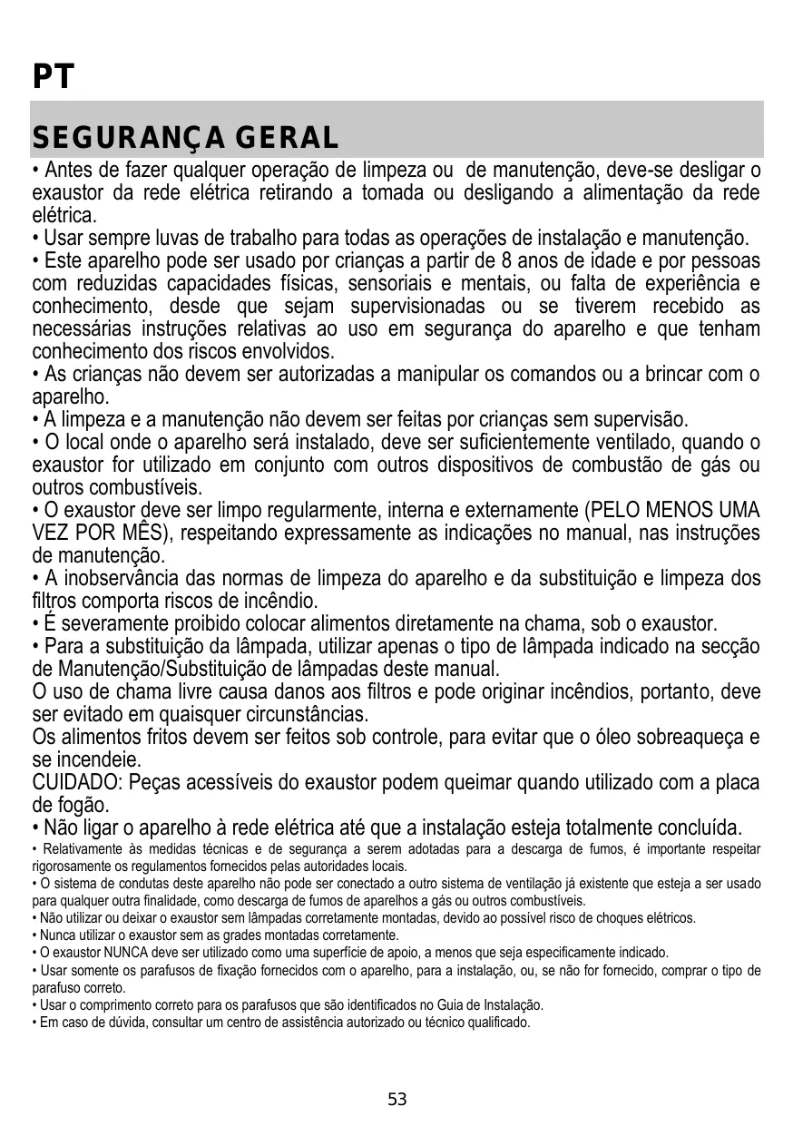 • Anders, contacteer onze Klantenservice (Het telefoonnummer staat in het garantieboekje). • Para la sustitución de la lámpara sólo utilizar el tipo de lámpara indicado en la sección de mantenimiento/sustitución de este manual. El uso de una llama libre es perjudicial para los filtros y puede provocar incendios, por lo tanto, debe evitarse en cualquier caso. Los fritos debe realizarse con cuidado para evitar que el aceite caliente prenda fuego. ATENCIÓN: Cuando la placa de cocción está funcionando las partes accesibles de la campana pueden calentarse. • No conectar la unidad a la red eléctrica hasta que la instalación sea totalmente completada. • En cuanto a las medidas técnicas y de seguridad a adoptar para la descarga de los humos, seguir estrictamente lo previsto por los reglamentos de las autoridades locales competentes. • El aire aspirado no debe ser transportado en un conducto usado para la descarga de humos producidos por dispositivos de combustión a gas u otros combustibles. • No utilizar ni dejar la campana sin las luces correctamente instaladas debido al posible riesgo de descarga eléctrica. • No utilizar nunca la campana sin la rejilla montada correctamente! • La campana NUNCA debe utilizarse como una superficie de apoyo a menos que así se indique específicamente. • Utilizar sólo los tornillos para fijación suministrados con el producto para su instalación, o, si no se suministran, comprar el tipo correcto de tornillos. Utilizar la longitud correcta para los tornillos que se identifican en la Guía de instalación. • En caso de duda, consultar el centro de asistencia autorizado o un similar personal calificado.
