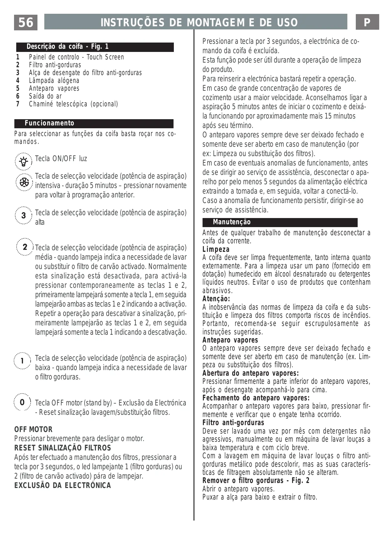 Touche de sélection vitesse (puissance d’aspiration) basse – lorsqu’elle clignote, elle inique qu’il faut laver le filtre à graisse. Touche OFF moteur (stand by) – Exclusion de l’Électronique – Reset signalisation lavage / remplacement filtres. OFF-MOTEUR Appuyer rapidement pour éteindre le moteur RESET SIGNALISATION FILTRES Après avoir effectuer l’entretien des filtres, appuyez sur la touche pendant 3 secondes, le led clignotant 1 (filtre graisse) ou 2 (filtre à charbon) arrête de clignoter. EXCLUSION DE L’ÉLECTRONIQUE Appuyez sur la touche pendant 3 secondes, l’électronique de commande de la hotte est exclue. Cette fonction peut être utile pendant l’opération de nettoyage du produit. Pour réinsérer l’électronique, il suffira de répéter l’opération.