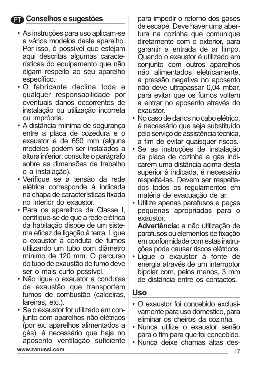 éviter tout risque d’accident. Si les instructions d’installation du plan de cuisson à gaz spécifient une distance supérieure à celle indiquée ci-dessus, veuillez impérativement en tenir compte. Toutes les normes concernant l’évacuation de l’air doivent être respectées. Utiliser exclusivement des vis et des petites pièces du type adapté pour la hotte. Attention: toute installation des vis et des dispositifs de fixation non conforme aux présentes instructions peut entraîner des risques de décharges électriques. Brancher la hotte à l’alimentation de secteur avec un interrupteur bipolaire ayant une ouverture des contacts d’au moins 3 mm. www.zanussi.com