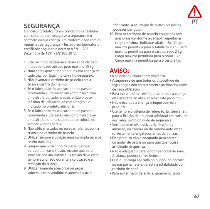 (1) I prodotti acquistati presso rivenditori che rimuovono o modificano le etichette o i numeri di identificazione sono considerati non autorizzati. Prodotti acquistati presso rivenditori non autorizzati sono considerati essi stessi non autorizzati. Nessuna garanzia si applica a questi prodotti, in quanto l’autenticità di questi prodotti non può essere accertata. SEGURANÇA Os nossos produtos foram concebidos e testados com cuidado para assegurar a segurança e o conforto da sua criança. Em conformidade com os requisitos de segurança – Testado em laboratório certificado segundo o decreto n.° 91-1292 Dezembro de 1991 - EN1888:2012.