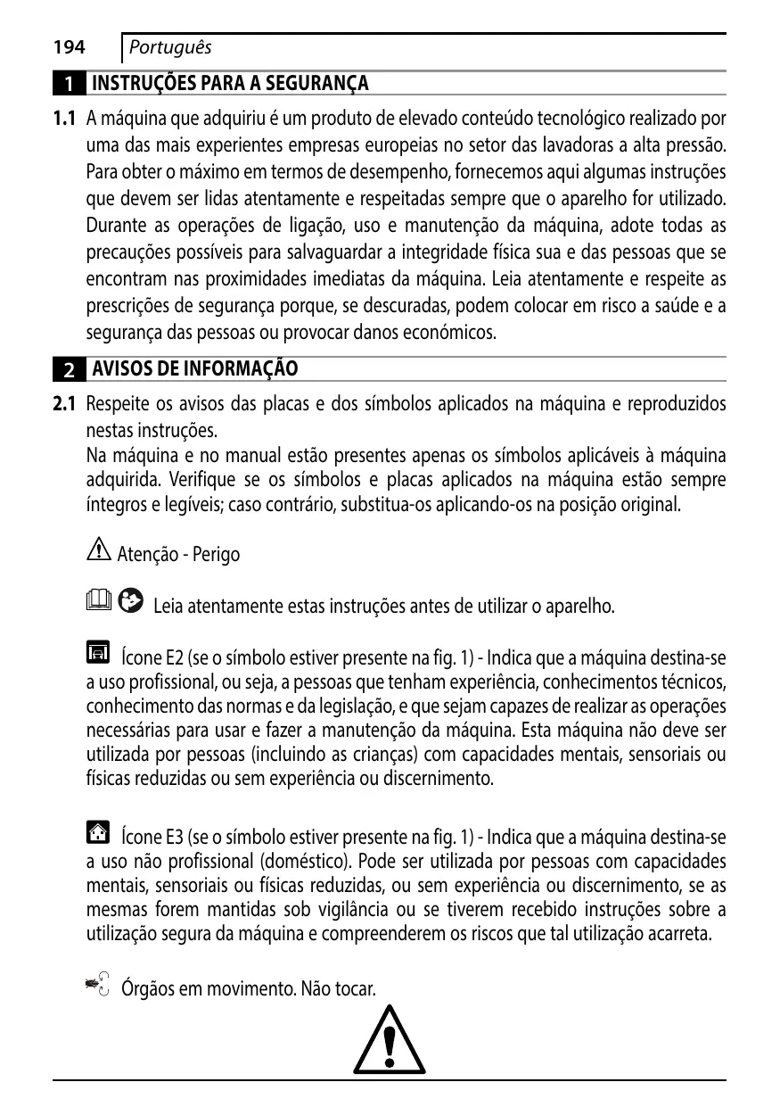 EN 62233; EN 50581 Sen henkilön nimi ja osoite, joka on valtuutettu kokoamaan teknisen eritelmän: Stefano Reverberi / AR Toimitusjohtaja Via M.L. King 3 - 41122 Modena, Italia Direktiivissä 2000/14/EY vaadittu vaatimustenmukaisuuden arviointimenettely on toteutettu liitteen V mukaan. Mallinro 2.1 Respecter les pictogrammes de sécurité et les symboles figurant sur l'appareil et dans ce manuel. Seuls les symboles concernant l'appareil acheté sont reproduits sur l'appareil et dans le manuel. S'assurer que les symboles et les pictogrammes de sécurité sur l'appareil sont lisibles et en bon état. Dans le cas contraire, les remplacer en respectant la position d'origine. Attention - Danger Lire attentivement ces instructions avant emploi. Icône E2 (si le symbole est présent sur fig. 1) - Elle indique que l'appareil est conçu pour un usage professionnel, c'est-à-dire pour les personnes qui ont de l'expérience, la connaissance technique, normative, législative et qui sont en mesure d'exécuter les opérations nécessaires à l'utilisation et à la maintenance de l'appareil. Cet appareil ne doit pas être utilisé par des personnes (enfants inclus) dont les capacités physiques, sensorielles ou mentales sont réduites, ou par des personnes sans expérience ni formation. Icône E3 (si le symbole est présent sur fig. 1) - Elle indique que l'appareil est conçu pour un usage non professionnel (domestique). Il peut être utilisé par des personnes aux capacités physiques, sensorielles ou mentales réduites, ou manquant d'expérience ou de connaissance, à partir du moment où elles sont surveillées ou ont reçu des explications permettant d'utiliser l'appareil en toute sécurité et comprennent les risques impliqués. Organes en mouvement. Ne pas toucher.