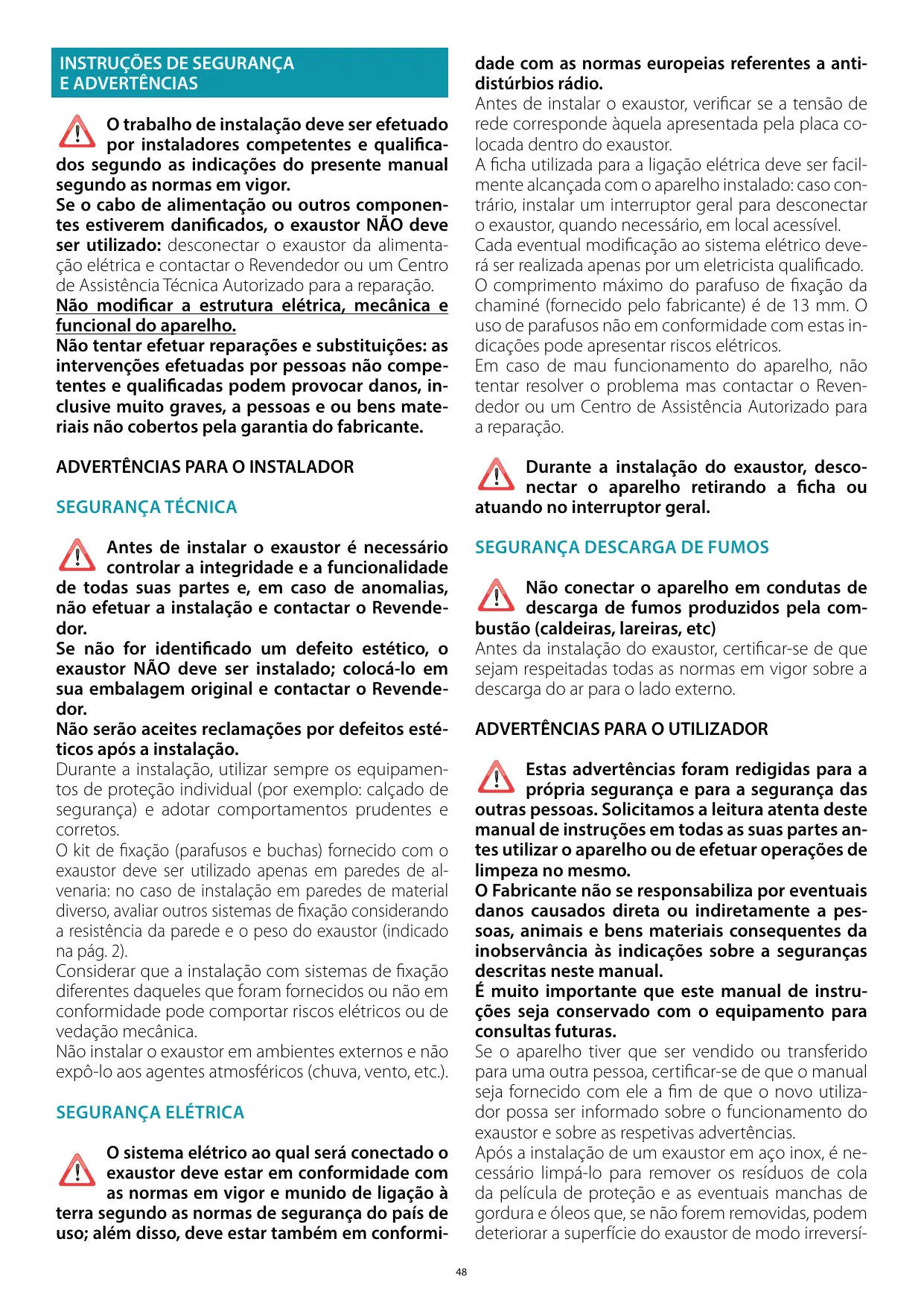 O trabalho de instalação deve ser efetuado por instaladores competentes e qualificados segundo as indicações do presente manual segundo as normas em vigor. Se o cabo de alimentação ou outros componentes estiverem danificados, o exaustor NÃO deve ser utilizado: desconectar o exaustor da alimentação elétrica e contactar o Revendedor ou um Centro de Assistência Técnica Autorizado para a reparação. Não modificar a estrutura elétrica, mecânica e funcional do aparelho. Não tentar efetuar reparações e substituições: as intervenções efetuadas por pessoas não competentes e qualificadas podem provocar danos, inclusive muito graves, a pessoas e ou bens materiais não cobertos pela garantia do fabricante.