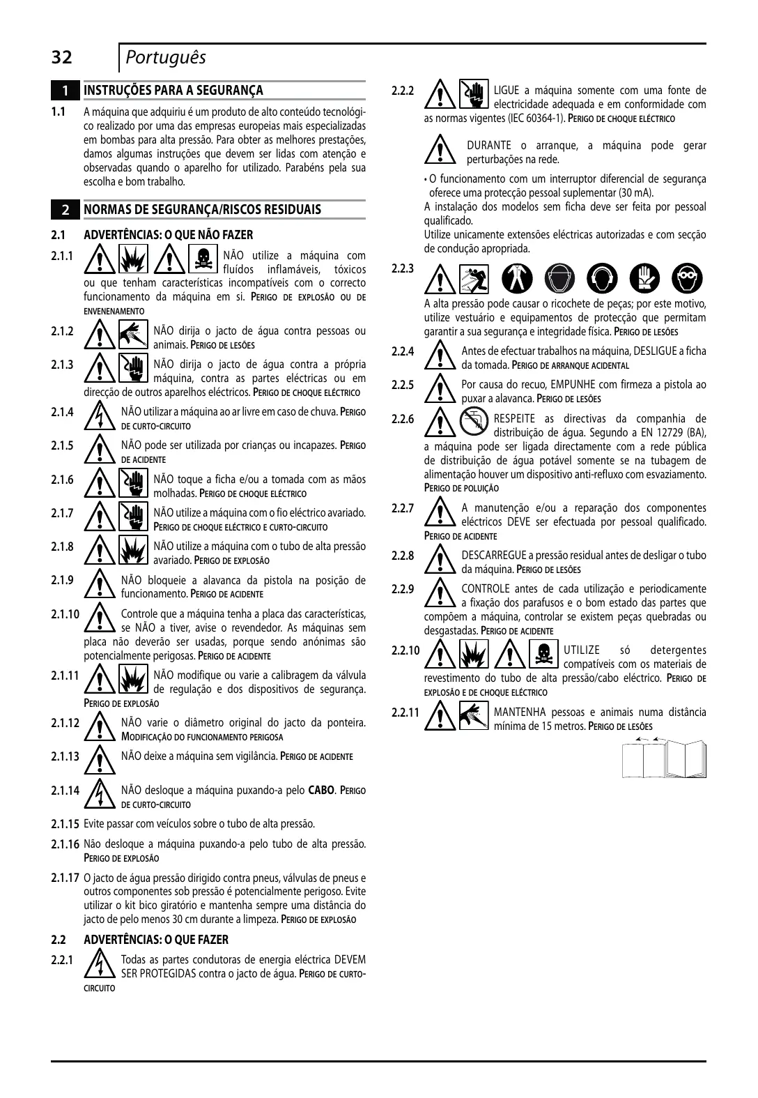 2.2.3 A alta pressão pode causar o ricochete de peças; por este motivo, utilize vestuário e equipamentos de protecção que permitam