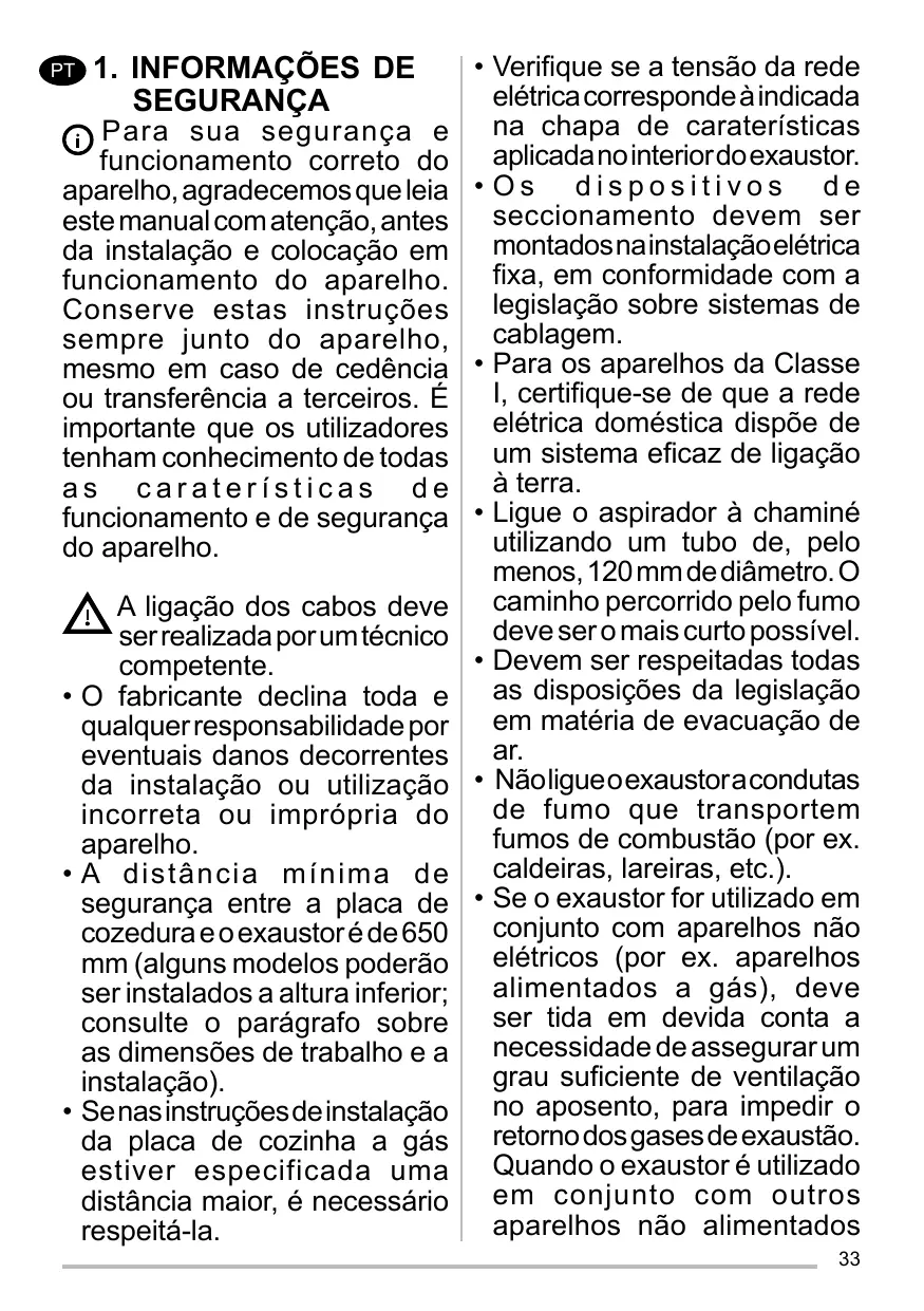 1. SICHERHEITSINFORMATIONEN Zu Ihrer eigenen Sicherheit und für die korrekte Funktion des Gerätes lesen Sie bitte diese Betriebsanleitung aufmerksam durch, bevor Sie das Gerät installieren und benutzen. à une installation ou à une utilisation impropre. Ladistancedesécuritéminimum entre le plan de cuisson et la hotte aspirante est de 650 mm • (certains modèles peuvent être installés à une hauteur inférieure ; voir le paragraphe concernant les dimensions de travail et l’installation). Si les instructions d’installation du plan de cuisson à gaz spécifient une distance supérieure à celle indiquée cidessus, veuillez impérativement en tenir compte. Assurez-vous que la tension