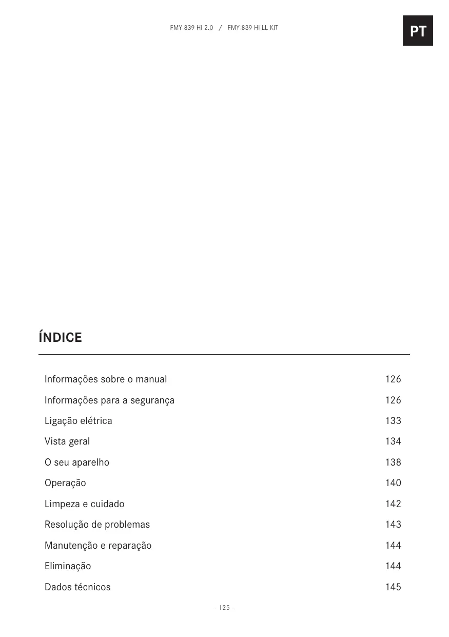 PT FMY 839 HI 2.0 / FMY 839 HI LL KIT INFORMAÇÕES SOBRE O MANUAL Estas instruções de utilização são válidas para diversos modelos do aparelho. Por isso, é possível que algumas das características e funções que aqui descrevemos não estejam disponíveis no modelo específico que comprou. X Antes de utilizar o dispositivo, leia as instruções com atenção. X Conservar as instruções de utilização. X Utilize o dispositivo descrito nestas instruções de exclusivamente conforme o uso previsto.