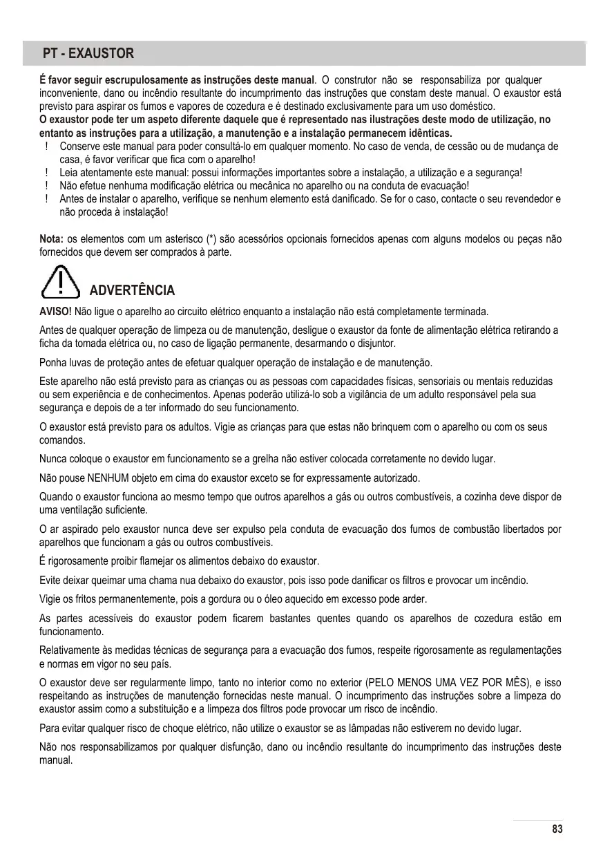 PT - EXAUSTOR É favor seguir escrupulosamente as instruções deste manual. O construtor não se responsabiliza por qualquer inconveniente, dano ou incêndio resultante do incumprimento das instruções que constam deste manual. O exaustor está previsto para aspirar os fumos e vapores de cozedura e é destinado exclusivamente para um uso doméstico. O exaustor pode ter um aspeto diferente daquele que é representado nas ilustrações deste modo de utilização, no entanto as instruções para a utilização, a manutenção e a instalação permanecem idênticas. ! Conserve este manual para poder consultá-lo em qualquer momento. No caso de venda, de cessão ou de mudança de casa, é favor verificar que fica com o aparelho! ! Leia atentamente este manual: possui informações importantes sobre a instalação, a utilização e a segurança! ! Não efetue nenhuma modificação elétrica ou mecânica no aparelho ou na conduta de evacuação! ! Antes de instalar o aparelho, verifique se nenhum elemento está danificado. Se for o caso, contacte o seu revendedor e não proceda à instalação! Nota: os elementos com um asterisco (*) são acessórios opcionais fornecidos apenas com alguns modelos ou peças não fornecidos que devem ser comprados à parte.