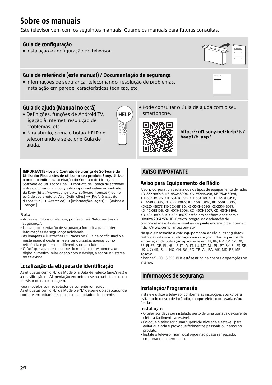 - Pode consultar o Guia de ajuda com o seu smartphone. https://rd1.sony.net/help/tv/ haep1/h_aep/ AVISO IMPORTANTE Aviso para Equipamento de Rádio A Sony Corporation declara que os tipos de equipamento de rádio KD-85XH8096, KE-85XH8096, KD-75XH8096, KE-75XH8096, KD-65XH8196, KD-65XH8096, KD-65XH8077, KE-65XH8196, KE-65XH8096, KE-65XH8077, KD-55XH8196, KD-55XH8096, KD-55XH8077, KE-55XH8196, KE-55XH8096, KE-55XH8077, KD-49XH8196, KD-49XH8096, KD-49XH8077, KD-43XH8196, KD-43XH8096, KD-43XH8077 estão em conformidade com a Diretiva 2014/53/UE. O texto integral da declaração de conformidade está disponível no seguinte endereço de Internet: http://www.compliance.sony.eu/ No que diz respeito a este equipamento de rádio, as seguintes restrições relativas à colocação em serviço ou dos requisitos de autorização de utilização aplicam-se em AT, BE, HR, CY, CZ, DK, EE, FI, FR, DE, EL, HU, IE, IT, LV, LT, LU, MT, NL, PL, PT, SK, SI, ES, SE, UK, UK (NI), IS, LI, NO, CH, BG, RO, TR, AL, BA, MK, MD, RS, ME, Kosovo : a banda 5.150 - 5.350 MHz está restringida apenas a operações no interior. Informações de segurança Instalação/Programação Instale e utilize o televisor conforme as instruções abaixo para evitar todo o risco de incêndio, choque elétrico ou avaria e/ou feridas. Instalação