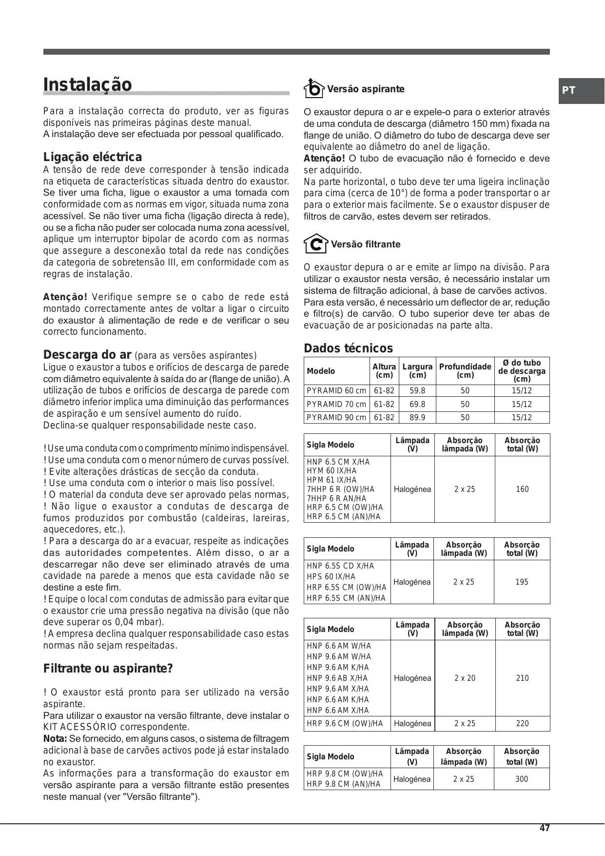 55 cm se o exaustor for instalado sobre 2H[DXVWRU181&$GHYHVHUXWLOL]DGR como plano de apoio, salvo indicação XPDSODFDGHFR]HGXUDHOpFWULFD expressa em contrário. Se as instruções de instalação do dispositivo de cozedura a gás HVSHFLILFDP XP GLVWkQFLD PDLRU p 2 ORFDO GHYH GLVSRU GH YHQWLODomR VX¿FLHQWHTXDQGRRH[DXVWRUpXWLOL]DGR necessário considerá-la. em simultâneo com outros aparelhos que utilizem gás ou outros combustíveis. 2H[DXVWRUGLVS}HGHEXFKDVGH¿[DomR adequadas à maioria das paredes/ 2 DU DVSLUDGR QmR GHYH VHU GLULJLGR tectos. para uma conduta usada para a $LQGD DVVLP p QHFHVViULR FRQWDFWDU descarga de fumos produzidos por XPWpFQLFRTXDOL¿FDGRSDUDDVVHJXUDU aparelhos de combustão a gás ou a idoneidade dos materiais consoante outros combustíveis. o tipo de parede/tecto, que deve ser VX¿FLHQWHPHQWHUREXVWRSDUDVXSRUWDU 5HVSHLWHWRGDVDVQRUPDWLYDVUHIHUHQWHV o peso do exaustor. à descarga do ar. $WHQomR1mROLJXHRDSDUHOKRjUHGH HOpFWULFD DWp TXH D LQVWDODomR HVWHMD e VHYHUDPHQWH SURLELGR FR]LQKDU alimentos em chama livre sob o totalmente concluída. H[DXVWRU D XWLOL]DomR GH FKDPDV OLYUHVGDQL¿FDRV¿OWURVHSRGHSURYRFDU $QWHVGHTXDOTXHURSHUDomRGHOLPSH]D incêndios, como tal, deve ser evitada. ou manutenção, desligue o exaustor GDUHGHHOpFWULFDUHWLUDQGRD¿FKDGD tomada ou desligando o interruptor e DFRQVHOKiYHO PDQWHU VRE FRQWUROR constante a fritura de alimentos, para geral da casa. evitar que o óleo aquecido entre em combustão. 3DUDWRGDVDVRSHUDo}HVGHLQVWDODomR e manutenção, utilizar luvas de (PUHODomRjVPHGLGDVWpFQLFDVHGH protecção. segurança a adoptar para a descarga dos fumos, siga escrupulosamente os 2DSDUHOKRQmRVHGHVWLQDDRXVRSRU regulamentos das autoridades locais parte de crianças ou pessoas com competentes. capacidades físicas sensoriais e/ou mentais reduzidas ou sem experiência e conhecimentos, a menos que se eDFRQVHOKiYHOOLPSDUIUHTXHQWHPHQWH o produto, quer interna quer encontrem sob a supervisão ou tenham externamente (PELO MENOS UMA recebido instruções sobre o uso do 9(= 325 0Ç6 GH TXDOTXHU IRUPD aparelho por parte de uma pessoa respeite as instruções de manutenção responsável pela sua segurança. indicadas neste manual). $VFULDQoDVGHYHPVHUVXSHUYLVLRQDGDV para que não brinquem com o aparelho. 2 LQFXPSULPHQWR GDV QRUPDV GH limpeza do exaustor e da substituição H OLPSH]D GRV ¿OWURV LPSOLFD ULVFR GH 1XQFDXWLOL]DURSURGXWRVHP¿OWURGH incêndio. JRUGXUDFRUUHFWDPHQWHLQVWDODGR
