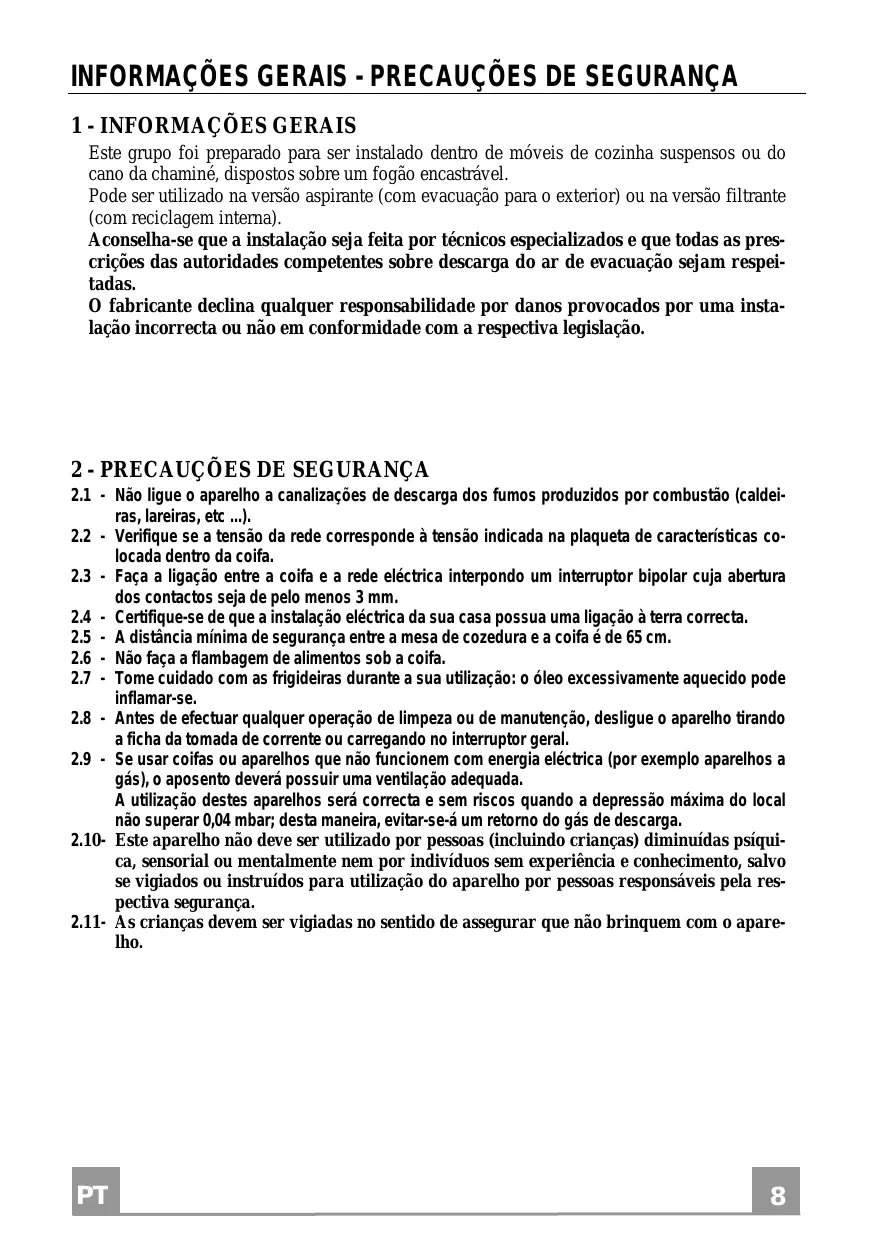 Este grupo foi preparado para ser instalado dentro de móveis de cozinha suspensos ou do cano da chaminé, dispostos sobre um fogão encastrável. Pode ser utilizado na versão aspirante (com evacuação para o exterior) ou na versão filtrante (com reciclagem interna). Aconselha-se que a instalação seja feita por técnicos especializados e que todas as prescrições das autoridades competentes sobre descarga do ar de evacuação sejam respeitadas. O fabricante declina qualquer responsabilidade por danos provocados por uma instalação incorrecta ou não em conformidade com a respectiva legislação.