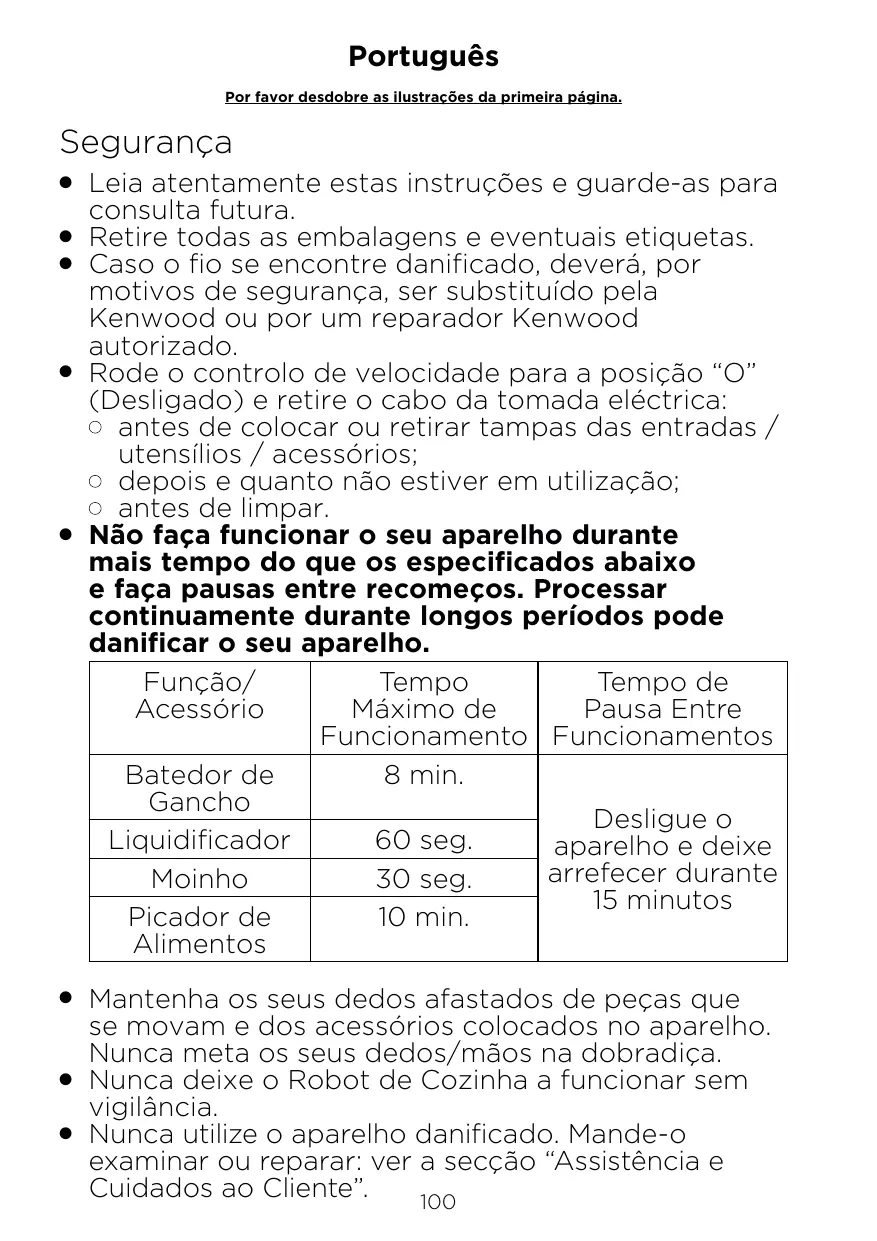 O Mantenha os seus dedos afastados de peças que se movam e dos acessórios colocados no aparelho. Nunca meta os seus dedos/mãos na dobradiça. O Nunca deixe o Robot de Cozinha a funcionar sem vigilância. O Nunca utilize o aparelho danificado. Mande-o examinar ou reparar: ver a secção “Assistência e Cuidados ao Cliente”. 100