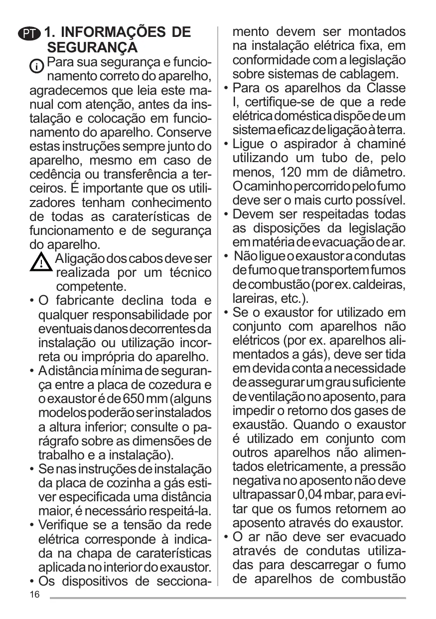 I, s’assurer que l’installation électrique de votre intérieur dispose d’une mise à la terre adéquate. Reliez l’aspirateur du conduit de cheminée avec un tube ayant un diamètre minimum de 120 mm. Le parcours des fumées doit être le plus court possible. Respecter toutes les normes concernant l’évacuation de l’air. Ne reliez pas la hotte aspirante aux conduits de cheminée qui acheminent les fumées de combustion (par ex. de chaudières, de cheminées, etc.). Si vous utilisez l’aspirateur en même temps que des appareils non électriques (par ex. fonctionnant au gaz), veillez à ce que la pièce soit adéquatement ventilée, afin d’empêcher le retour du flux des gaz d’évacuation. Si vous utilisez la hotte de cuisine en même temps que des appareils non alimentés à l’électricité, la pression négative dans la 11