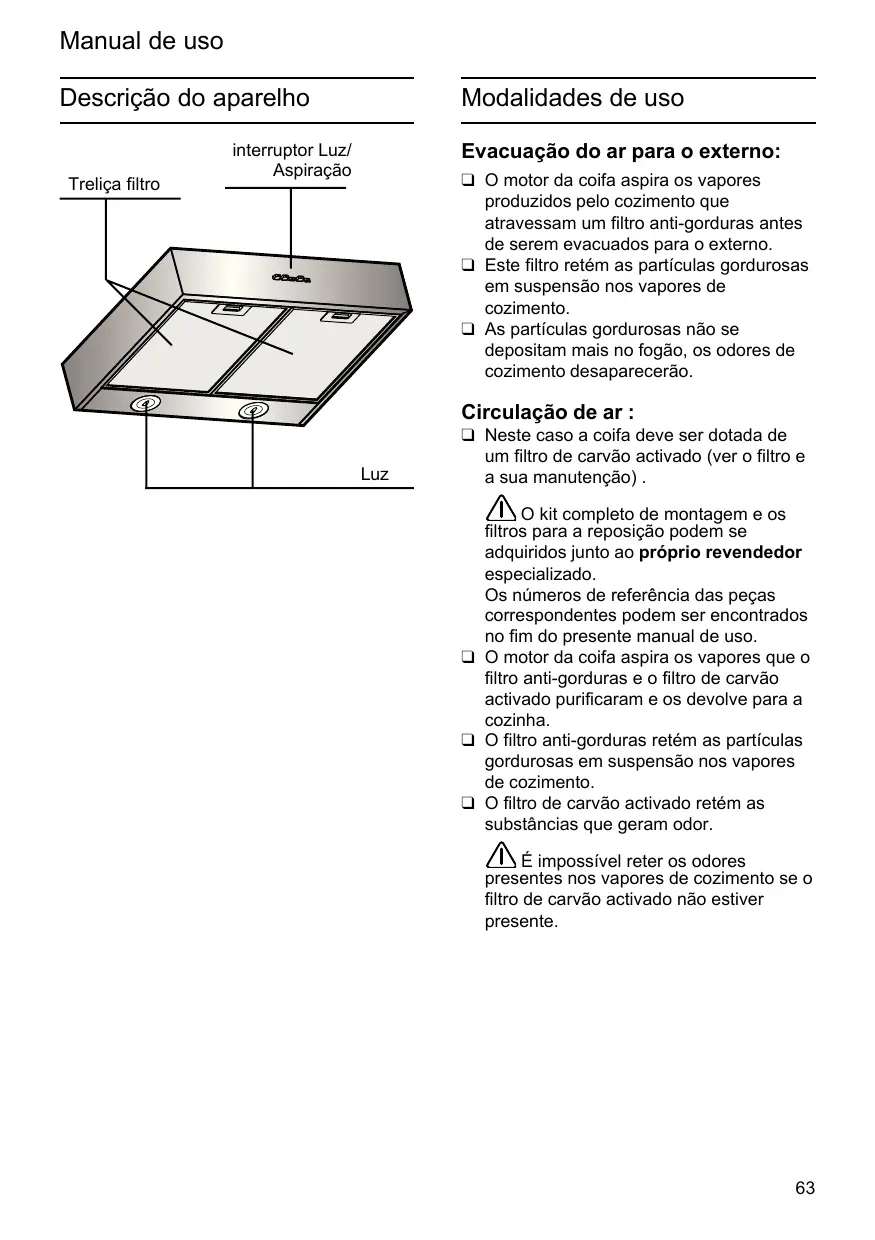 Antes do uso Advertências importantes: ❑ O presente manual de uso vale para várias versões do aparelho e, portanto, pode conter descrições de acessórios não presentes no próprio aparelho. ❑ Esta coifa de aspiração está em conformidade com as disposições de segurança vigentes. As reparações somente devem ser efectuadas por um especialista. Reparações executadas por pessoas não qualificadas aumentam consideravelmente os riscos para o usuário. ❑ Ler cuidadosamente o presente manual de uso antes de utilizar o aparelho pela primeira vez. O mesmo contém informações importantes não somente para a própria segurança, mas também para o uso e a manutenção do aparelho. ❑ Conservar o presente manual de instalação e de uso para um futuro proprietário do aparelho. Descarregar os materiais da embalagem em conformidade com as leis vigentes (ver manual de instalação). Esta coifa de aspiração somente se destina ao uso doméstico. Antes de qualquer operação de limpeza ou manutenção, desligar a coifa da rede eléctrica tirando a ficha ou desligando o interruptor geral da habitação. O aparelho não se destina ao uso por parte de crianças ou pessoas com capacidades físicas, sensoriais ou mentais reduzidas e com falta de experiência e conhecimento excepto se as mesmas não estiverem sendo supervisionadas ou instruídas no uso da aparelhagem por parte de uma pessoa responsável pela segurança das mesmas. As crianças devem ser controladas de maneira que não brinquem com o aparelho. Nunca utilizar a coifa sem a grelha correctamente montada! A coifa NUNCA deve ser utilizada como 64