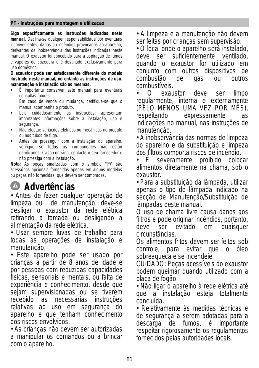 Montaje y modo de empleo Instruções para montagem e utilização ȅǻǾīǿǼȈ ȈȊȃǹȇȂȅȁȅīǾȈǾȈ Ȁǹǿ ȋȇǾȈǾȈ Monterings- och bruksanvisningar • La hotte doit être régulièrement nettoyée à la fois à l'intérieur et à l'extérieur (AU MOINS UNE FOIS PAR MOIS); cela devrait se faire en conformité avec les instructions d'entretien. Le non respect des instructions expressément fournies concernant le nettoyage de la hotte et des filtres peut provoquer des risques d'incendie. • Ne pas flamber d’aliments sous la hotte. • Pour le remplacement de la lampe, utilisez uniquement le type de lampe spécifié dans la section remplacement/maintenance lampe dans ce manuel. L'utilisation d'une flamme nue est dommageable pour les filtres et peut causer un incendie, par conséquent, il est déconseillé de l'utiliser. La friture doit être faite avec soin afin de s’assurer que l’huile surchauffée ne prenne pas feu. AVERTISSEMENT: Lorsque la table de cuisson est en fonctionnement, les parties accessibles de la hotte peuvent devenir très chaudes. • Ne pas brancher l'appareil au réseau électrique avant que l'installation ne soit complètement terminée. • En ce qui concerne les mesures techniques et de sécurité à prendre pour l'évacuation des fumées, respectez strictement les dispositions des règlements locales. • L’air ne doit pas être envoyé dans un conduit utilisé pour évacuer les fumées