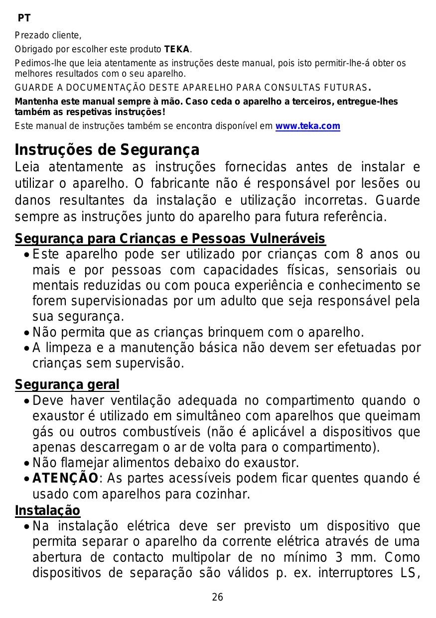 • The grease filters and the internal part of the extractor must be cleaned at least once a month depending on how often the extractor is used. Note that grease is deposited in the extractor when cooking, whether it is switched on or not. • We recommend the use of gloves and caution when cleaning the inside of the extractor. Gardez toujours le manuel d’utilisation à portée de main. Si vous prêtez cet appareil à quelqu’un, n’oubliez pas de donner aussi le manuel! Vous pouvez aussi télécharger le manuel d’utilisation sur www.teka.com