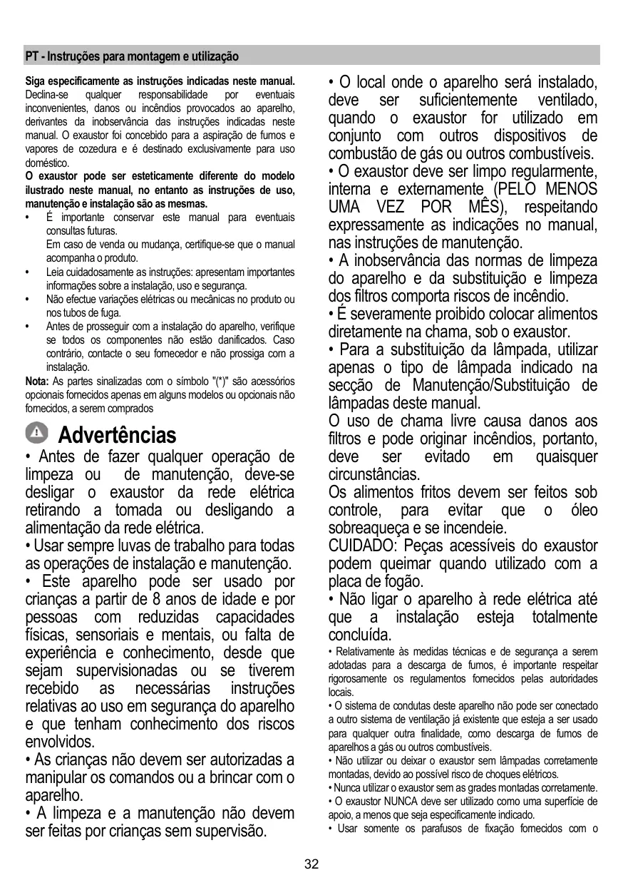 • Antes de fazer qualquer operação de limpeza ou de manutenção, deve-se desligar o exaustor da rede elétrica retirando a tomada ou desligando a alimentação da rede elétrica. • Usar sempre luvas de trabalho para todas as operações de instalação e manutenção. • Este aparelho pode ser usado por crianças a partir de 8 anos de idade e por pessoas com reduzidas capacidades físicas, sensoriais e mentais, ou falta de experiência e conhecimento, desde que sejam supervisionadas ou se tiverem recebido as necessárias instruções relativas ao uso em segurança do aparelho e que tenham conhecimento dos riscos envolvidos. • As crianças não devem ser autorizadas a manipular os comandos ou a brincar com o aparelho. • A limpeza e a manutenção não devem ser feitas por crianças sem supervisão.