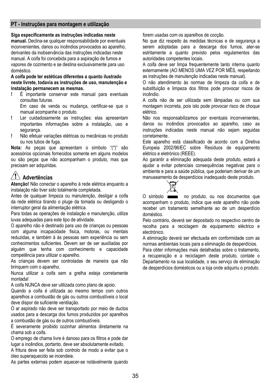 Montaje y modo de empleo Instruções para montagem e utilização ΟΔΗΓΙΕΣ ΣΥΝΑΡΜΟΛΟΓΗΣΗΣ ΚΑΙ ΧΡΗΣΗΣ Monterings- och bruksanvisningar En ce qui concerne les mesures techniques et de sécurité à adopter pour l’évacuation des fumées, s’en tenir strictement à ce qui est prévu dans les règlements des autorités locales compétentes. La hotte doit être régulièrement nettoyée, aussi bien à l’intérieur qu’à l’extérieur (AU MOINS UNE FOIS PAR MOIS, respecter néanmoins les instructions relatives à l’entretien fournies dans ce manuel). La non observation de ces normes de nettoyage de la hotte et du changement et nettoyage des filtres comporte des risques d’incendie. Ne pas utiliser ou laisser la hotte sans que les ampoules soient correctement placées pour éviter tout risque de choc électrique. La société décline toute responsabilité pour d’éventuels inconvénients, dégâts ou incendies provoqués par l’appareil et dérivés de la non observation des instructions reprises dans ce manuel. Cet appareil porte le symbole du recyclage conformément à la Directive Européenne 2002/96/CE concernant les Déchets d’Équipements Électriques et Électroniques (DEEE ou WEEE). En procédant correctement à la mise au rebut de cet appareil, vous contribuerez à empêcher toute conséquence nuisible pour l’environnement et la santé de l’homme.