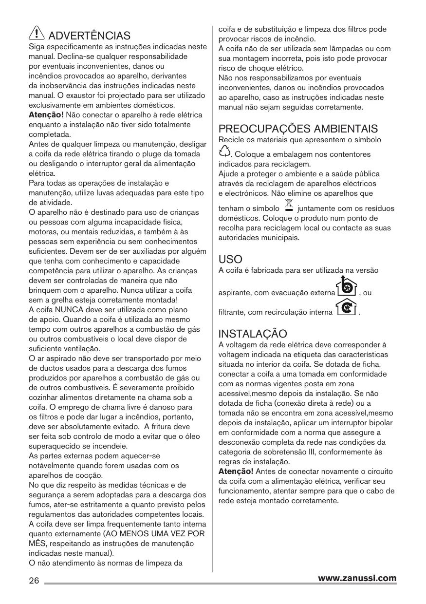 ZHC92341XA - Exaustor de cozinha ZANUSSI - Manual de utilização gratuito
