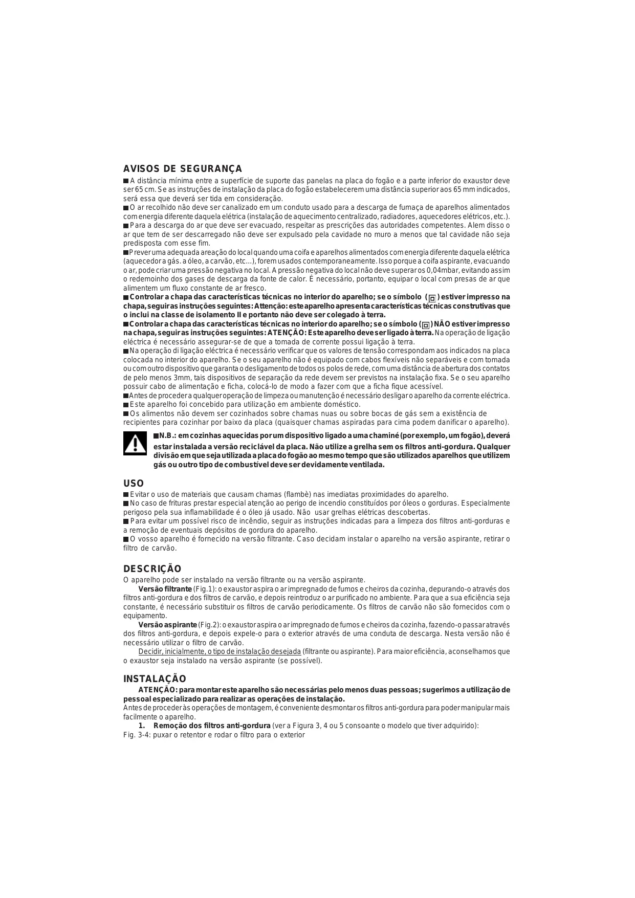 En el caso de freír tener suma atención al peligro de incendio que constituyen el aceite y las grasas. Particularmente peligroso por su inflamabilidad es el aceite ya usado. No usar parrillas eléctricas descubiertas. Para evitar un posible riesgo de incendio, atenerse a las instrucciones indicadas respecto a la limpieza de los filtros antigrasa y a la eliminación de eventuales depósitos de grasa sobre el aparato. El aparato se entrega en la versión filtrante. Si se desea instalarlo en la versión aspirante es necesario extraer el filtro de carbón.