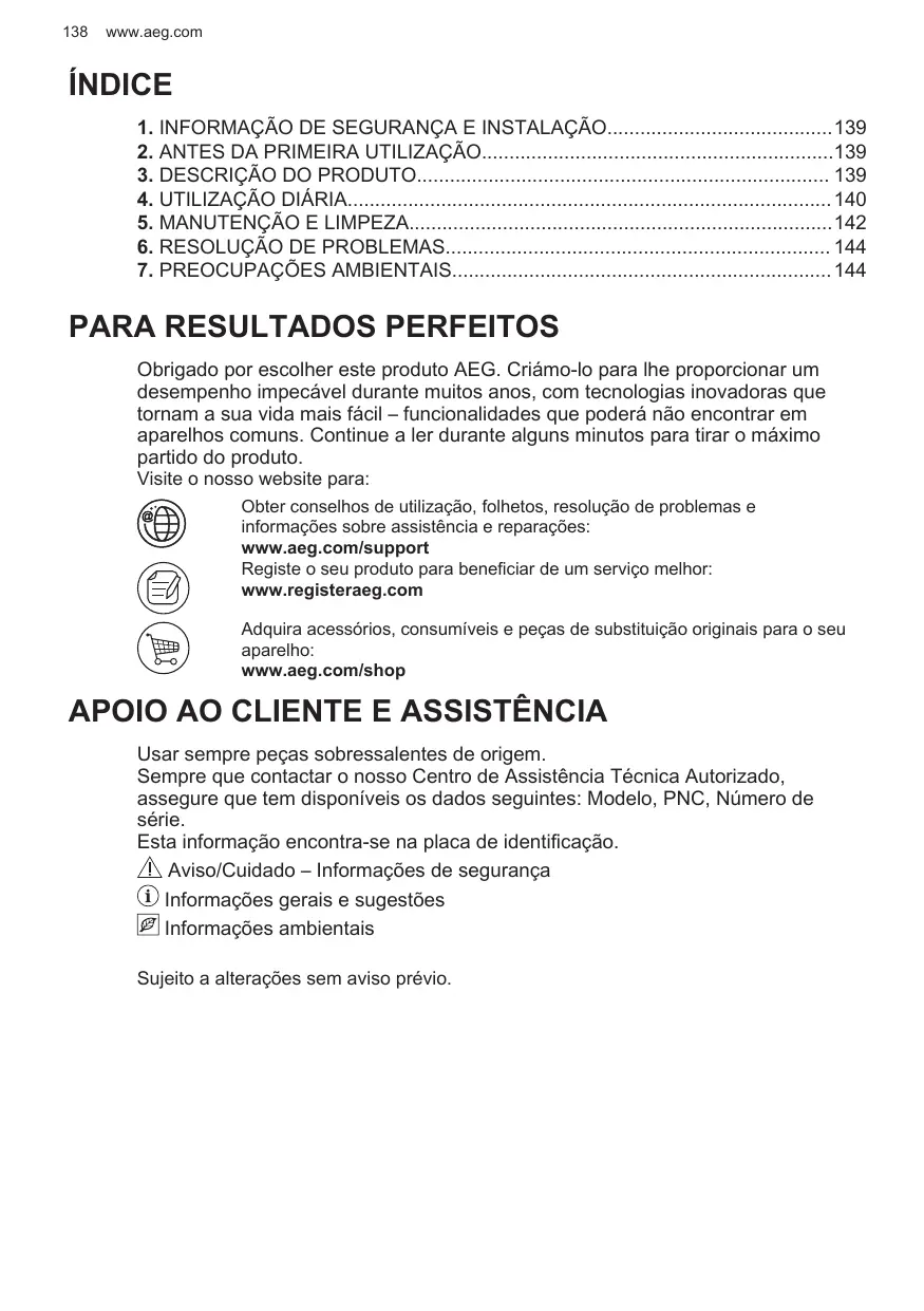 ÍNDICE 1. INFORMAÇÃO DE SEGURANÇA E INSTALAÇÃO139 2. ANTES DA PRIMEIRA UTILIZAÇÃO139 3. DESCRIÇÃO DO PRODUTO 139 4. UTILIZAÇÃO DIÁRIA 140 5. MANUTENÇÃO E LIMPEZA142 6. RESOLUÇÃO DE PROBLEMAS 144 7. PREOCUPAÇÕES AMBIENTAIS 144