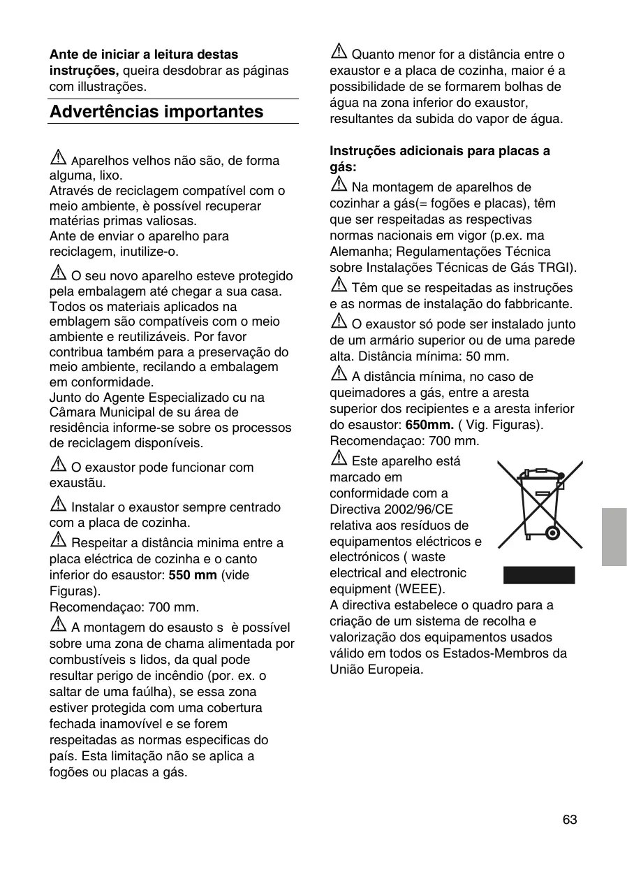 Remarques supplémentaires concernant le cuisinières à gaz: Lors du montage de foyers gaz, veuillez respecter les dispositions légales en vigueur dans votre pays (en Allemagne par example: les Règles techniques TRGI régissant l‘installation du gaz). Respectez les prescriptions et consignes d’encastrement en leur version applicable, publiées par les fabricants d’appareils au gaz. La hotte aspirante ne pourra cotoyer que sur un côté un meuble haut ou une paroi haute. Ecart minimum: 50 mm. Ecart minimum, en présence de foyers au gaz, entre le bord supérieur de la grille support et le bord inférieur de la hotte: 650 mm. (voir figures). Recommandation: 700 mm. Cet appareil est marqué selon la directive européenne 2002/96/CE relative aux appareils Plus l’ecart est faible entre la hotte aspirante et le foyer et plus il se pourra que la vapeur montant des casseroles se 23
