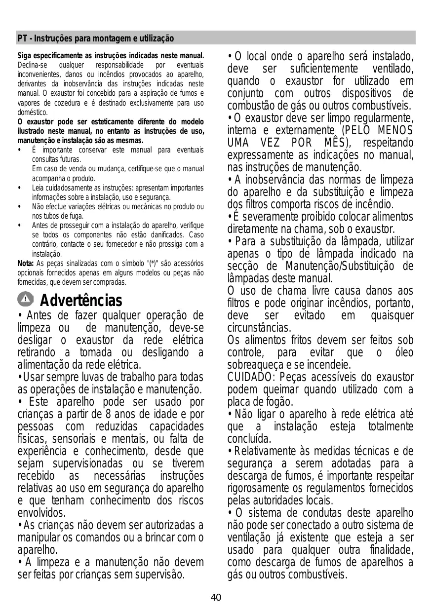 Montaje y modo de empleo Instruções para montagem e utilização ΟΔΗΓΙΕΣ ΣΥΝΑΡΜΟΛΟΓΗΣΗΣ ΚΑΙ ΧΡΗΣΗΣ Monterings- och bruksanvisningar • La hotte doit être régulièrement nettoyée à la fois à l'intérieur et à l'extérieur (AU MOINS UNE FOIS PAR MOIS); cela devrait se faire en conformité avec les instructions d'entretien. Le non respect des instructions expressément fournies concernant le nettoyage de la hotte et des filtres peut provoquer des risques d'incendie. • Ne pas flamber d’aliments sous la hotte. • Pour le remplacement de la lampe, utilisez uniquement le type de lampe spécifié dans la section remplacement/maintenance lampe dans ce manuel. L'utilisation d'une flamme nue est dommageable pour les filtres et peut causer un incendie, par conséquent, il est déconseillé de l'utiliser. La friture doit être faite avec soin afin de s’assurer que l’huile surchauffée ne prenne pas feu. AVERTISSEMENT: Lorsque la table de cuisson est en fonctionnement, les parties accessibles de la hotte peuvent devenir très chaudes. • Ne pas brancher l'appareil au réseau électrique avant que l'installation ne soit complètement terminée. • En ce qui concerne les mesures techniques et de sécurité à prendre pour l'évacuation des fumées, respectez strictement les dispositions des règlements locales. • L’air ne doit pas être envoyé dans un conduit utilisé pour évacuer les fumées