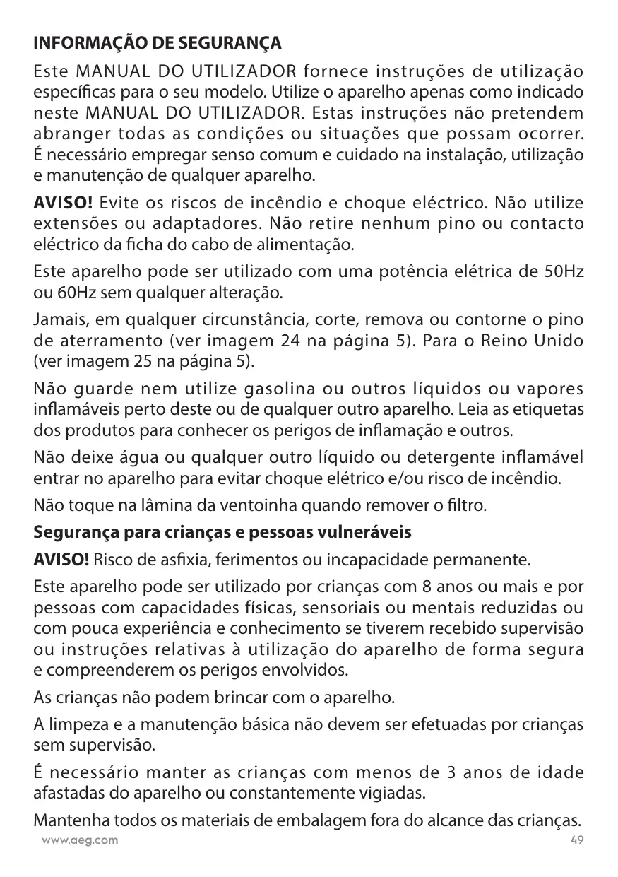 Este MANUAL DO UTILIZADOR fornece instruções de utilização específicas para o seu modelo. Utilize o aparelho apenas como indicado neste MANUAL DO UTILIZADOR. Estas instruções não pretendem abranger todas as condições ou situações que possam ocorrer. É necessário empregar senso comum e cuidado na instalação, utilização e manutenção de qualquer aparelho. AVISO! Evite os riscos de incêndio e choque eléctrico. Não utilize extensões ou adaptadores. Não retire nenhum pino ou contacto eléctrico da ficha do cabo de alimentação. Este aparelho pode ser utilizado com uma potência elétrica de 50Hz ou 60Hz sem qualquer alteração. Jamais, em qualquer circunstância, corte, remova ou contorne o pino de aterramento (ver imagem 24 na página 5). Para o Reino Unido (ver imagem 25 na página 5). Não guarde nem utilize gasolina ou outros líquidos ou vapores inflamáveis perto deste ou de qualquer outro aparelho. Leia as etiquetas dos produtos para conhecer os perigos de inflamação e outros. Não deixe água ou qualquer outro líquido ou detergente inflamável entrar no aparelho para evitar choque elétrico e/ou risco de incêndio. Não toque na lâmina da ventoinha quando remover o filtro. Segurança para crianças e pessoas vulneráveis AVISO! Risco de asfixia, ferimentos ou incapacidade permanente. Este aparelho pode ser utilizado por crianças com 8 anos ou mais e por pessoas com capacidades físicas, sensoriais ou mentais reduzidas ou com pouca experiência e conhecimento se tiverem recebido supervisão ou instruções relativas à utilização do aparelho de forma segura e compreenderem os perigos envolvidos. As crianças não podem brincar com o aparelho. A limpeza e a manutenção básica não devem ser efetuadas por crianças sem supervisão. É necessário manter as crianças com menos de 3 anos de idade afastadas do aparelho ou constantemente vigiadas. Mantenha todos os materiais de embalagem fora do alcance das crianças. www.aeg.com