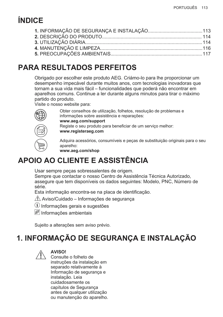 ÍNDICE 1. INFORMAÇÃO DE SEGURANÇA E INSTALAÇÃO113 2. DESCRIÇÃO DO PRODUTO 114 3. UTILIZAÇÃO DIÁRIA 114 4. MANUTENÇÃO E LIMPEZA116 5. PREOCUPAÇÕES AMBIENTAIS 117