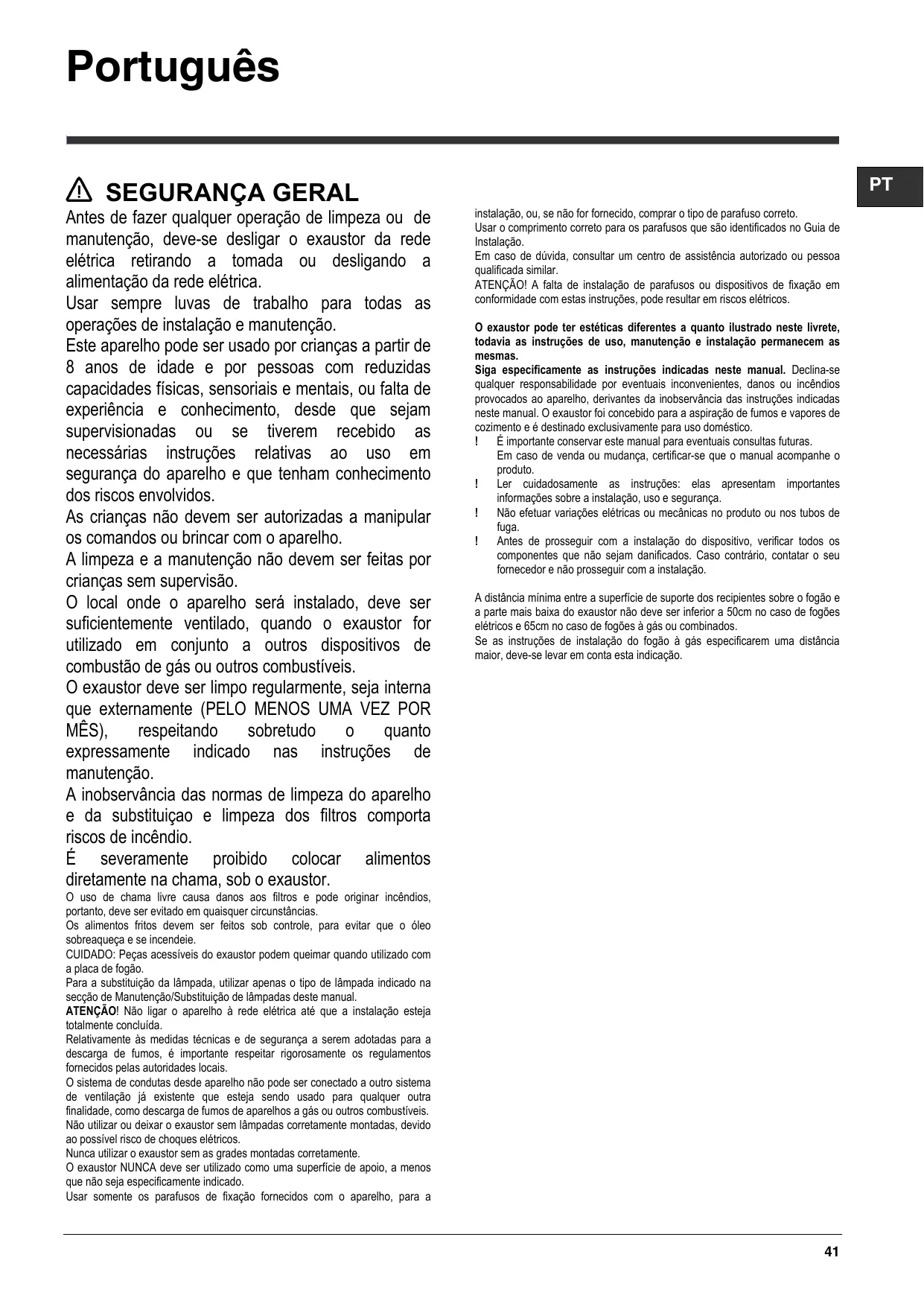 PT instalação, ou, se não for fornecido, comprar o tipo de parafuso correto. Usar o comprimento correto para os parafusos que são identificados no Guia de Instalação. Em caso de dúvida, consultar um centro de assistência autorizado ou pessoa qualificada similar. ATENÇÃO! A falta de instalação de parafusos ou dispositivos de fixação em conformidade com estas instruções, pode resultar em riscos elétricos. O exaustor pode ter estéticas diferentes a quanto ilustrado neste livrete, todavia as instruções de uso, manutenção e instalação permanecem as mesmas. Siga especificamente as instruções indicadas neste manual. Declina-se qualquer responsabilidade por eventuais inconvenientes, danos ou incêndios provocados ao aparelho, derivantes da inobservância das instruções indicadas neste manual. O exaustor foi concebido para a aspiração de fumos e vapores de cozimento e é destinado exclusivamente para uso doméstico. ! É importante conservar este manual para eventuais consultas futuras. Em caso de venda ou mudança, certificar-se que o manual acompanhe o produto. ! Ler cuidadosamente as instruções: elas apresentam importantes informações sobre a instalação, uso e segurança. ! Não efetuar variações elétricas ou mecânicas no produto ou nos tubos de fuga. ! Antes de prosseguir com a instalação do dispositivo, verificar todos os componentes que não sejam danificados. Caso contrário, contatar o seu fornecedor e não prosseguir com a instalação. A distância mínima entre a superfície de suporte dos recipientes sobre o fogão e a parte mais baixa do exaustor não deve ser inferior a 50cm no caso de fogões elétricos e 65cm no caso de fogões à gás ou combinados. Se as instruções de instalação do fogão à gás especificarem uma distância maior, deve-se levar em conta esta indicação.